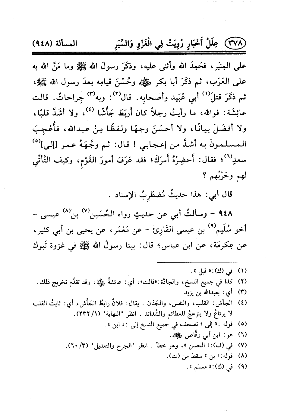 ٩٤٨ - وسألتُ أَبِي عَنْ حديثٍ رَوَاهُ الحُسَين (٧) بن (٨) عيسى - أخو سُلَيم (٩) بْنِ عِيسَى القَارِئ - عَنْ مَعْمَر، عَنْ يَحْيَى بْنِ أَبِي كَثِيرٍ، عَنْ عِكرمَة، عَنِ ابْنِ عَبَّاسٍ؛ قال: بينا رسولُ الله (ص) في غزوة تَبوك