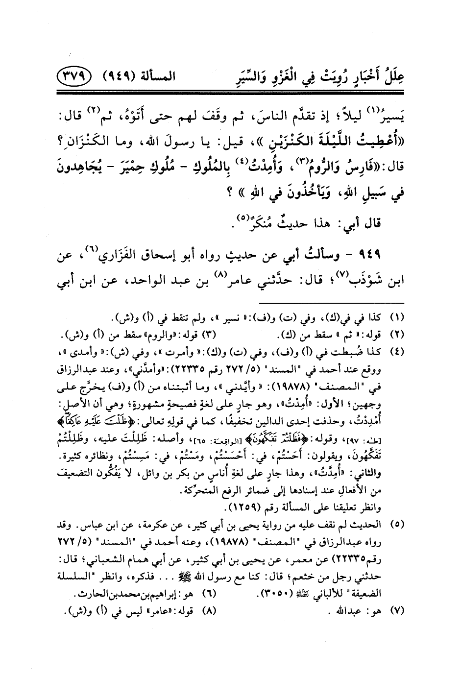 ٩٤٩ - وسألتُ أَبِي عَنْ حديثٍ رَوَاهُ أَبُو إِسْحَاقَ الفَزَاري (٦) ، عَنِ ابْنِ شَوْذَب (٧) ؛ قَالَ: حدَّثني عَامِرُ (٨) بْنُ عَبْدِ الْوَاحِدِ، عَنِ ابْنِ أَبِي