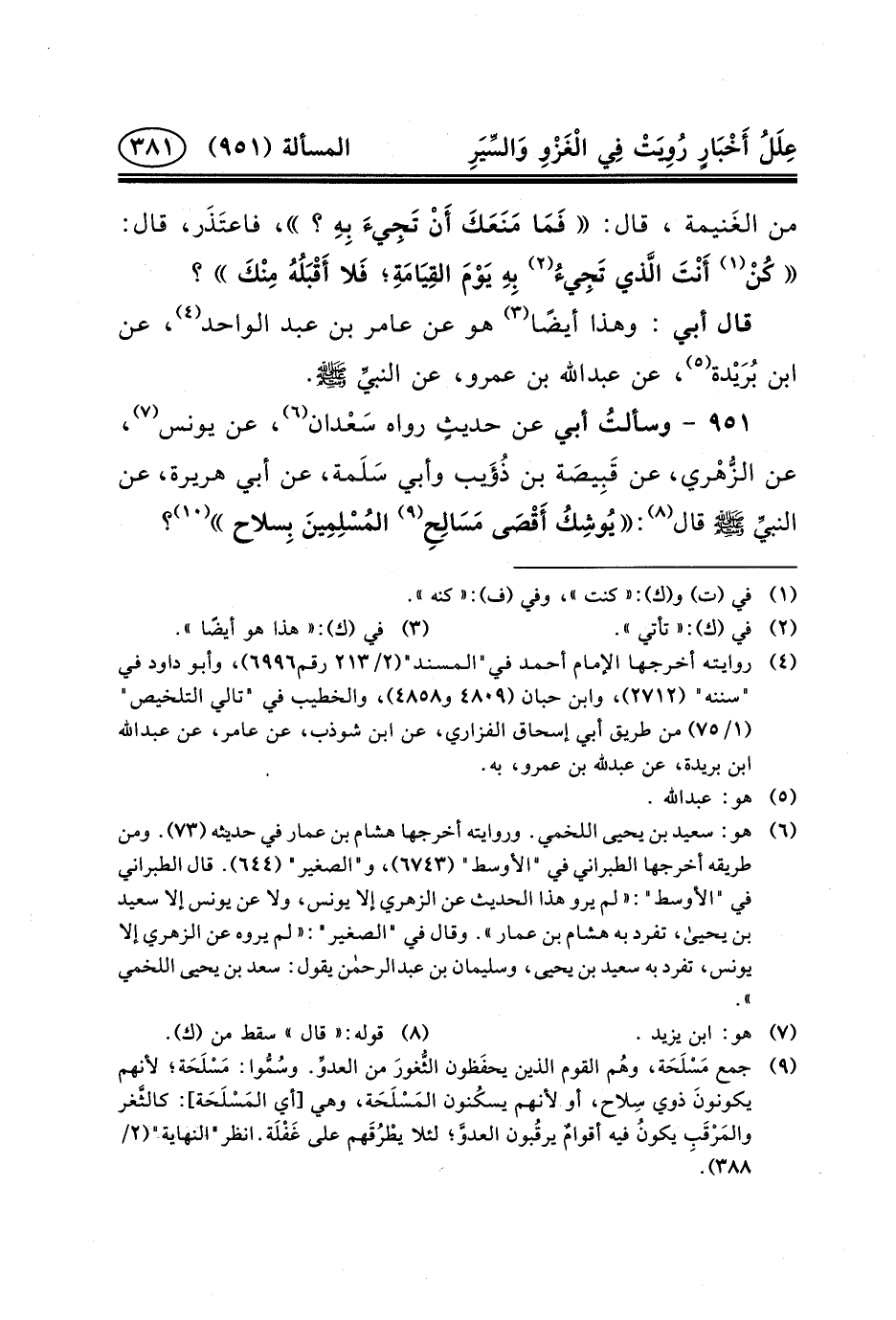 ٩٥١ - وسألتُ أَبِي عَنْ حديثٍ رَوَاهُ سَعْدان (٦) ، عَنْ يُونُسَ (٧) ، عَنِ الزُّهْري، عَنْ قَبِيصَة بْنِ ذُؤَيب وَأَبِي سَلَمة، عَنْ أَبِي هُرَيْرَةَ، عَنِ النبيِّ (ص) قَالَ (٨) : يُوشِكُ أَقْصَى مَسَالِحِ (٩) المُسْلِمِينَ بِسلاح (١٠) ؟