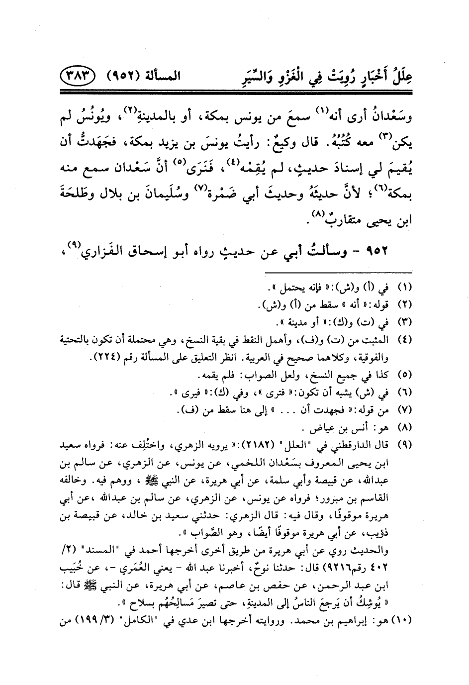 ٩٥٢ - وسألتُ أَبِي عَنْ حديثٍ رَوَاهُ أَبُو إِسْحَاقَ الفَزاري (٩) ،