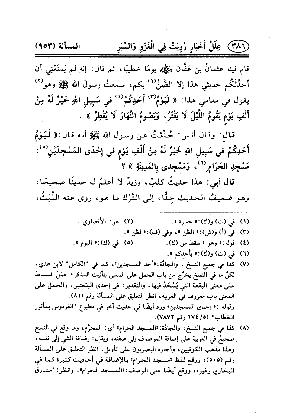 قَالَ: وَقَالَ أَنَسٌ: حُدِّثتُ عَنْ رَسُولِ اللَّهِ (ص) أَنَّهُ قَالَ: لَيَوْمُ أَحَدِكُمْ فِي سَبِيلِ اللهِ خَيْرٌ لَهُ مِنْ أَلْفِ يَوْمٍ في إِحْدَى المَسْجِدَيْنِ (٥) : مَسْجِدِ الحَرَام ِ (٦) ، وَمَسْجِدي بِالمَدِينَةِ؟