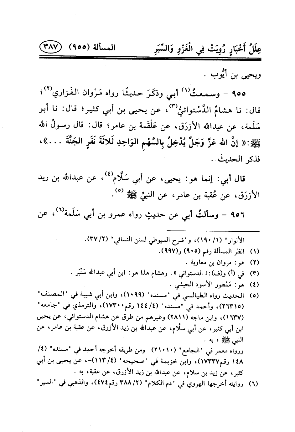 ٩٥٥- وسمعتُ (١) أَبِي وذكَرَ حَدِيثًا رَوَاهُ مَرْوان الفَزاري (٢) ؛ قال: نا هشامٌ الدَّسْتوائيُّ (٣) ، عَنْ يَحْيَى بْنِ أبي كثير؛ قال: نا أبو سَلَمة، عن عبد الله الأزرَق، عَنْ عَلْقَمة بْنِ عَامِرٍ؛ قال: قال رسولُ الله (ص) : إنَّ اللَّهَ عَزَّ وَجَلَّ يُدْخِلُ بِالسَّهْمِ الوَاحِدِ ثَلاثَةَ نَفَرٍ الجَنَّةَ ... ، فَذَكَرَ الحديثَ.