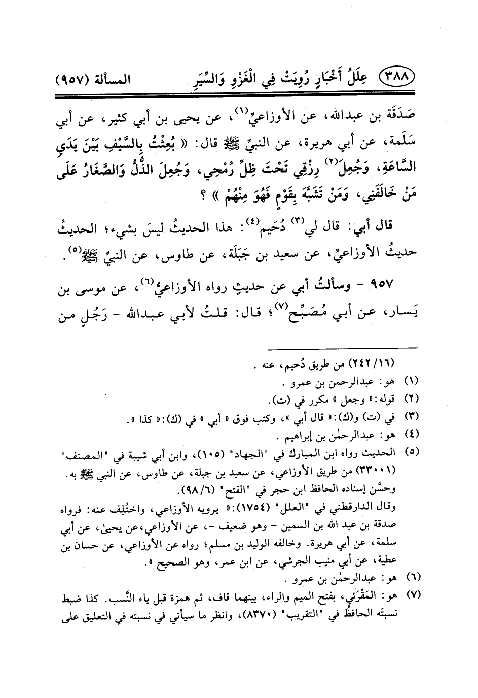 ٩٥٧ - وسألتُ أَبِي عَنْ حديثٍ رَوَاهُ الأوزاعيُّ (٦) ، عَنْ مُوسَى بْنِ يَسار، عَنْ أَبِي مُصَبِّح (٧) ؛ قَالَ: قلتُ لأبي عبد الله - رَجُلٍ من