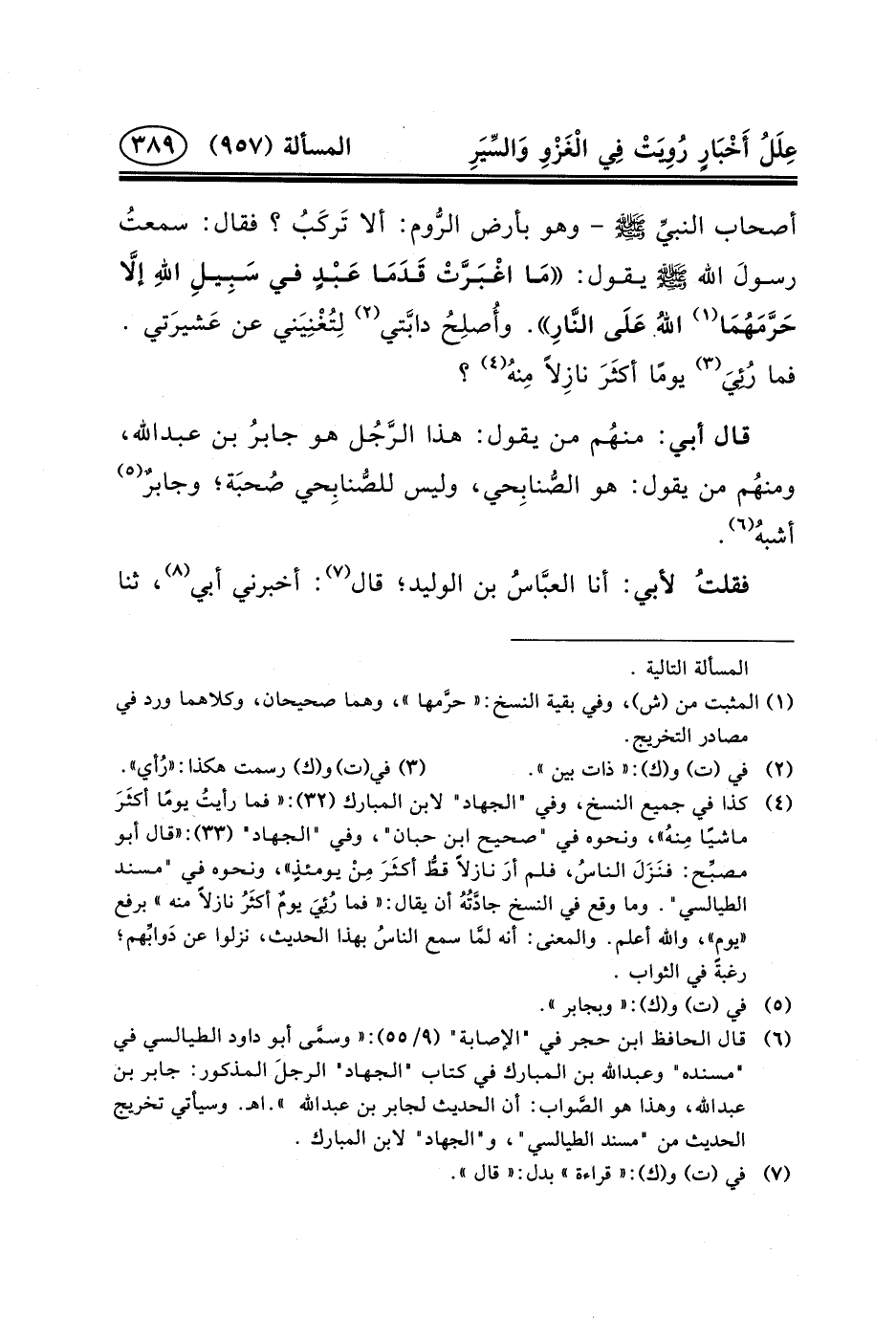 (٦) قال الحافظ ابن حجر في "الإصابة" (٩/٥٥) : «وسمَّى أبو داود الطيالسي في "مسنده" وعبد الله بن المبارك في كتاب "الجهاد" الرجلَ المذكور: جابر بن عبد الله، وهذا هو الصَّواب: أن الحديث لجابر بن عبد الله» . اهـ. وسيأتي تخريج الحديث من "مسند الطيالسي"، و"الجهاد" لابن المبارك.