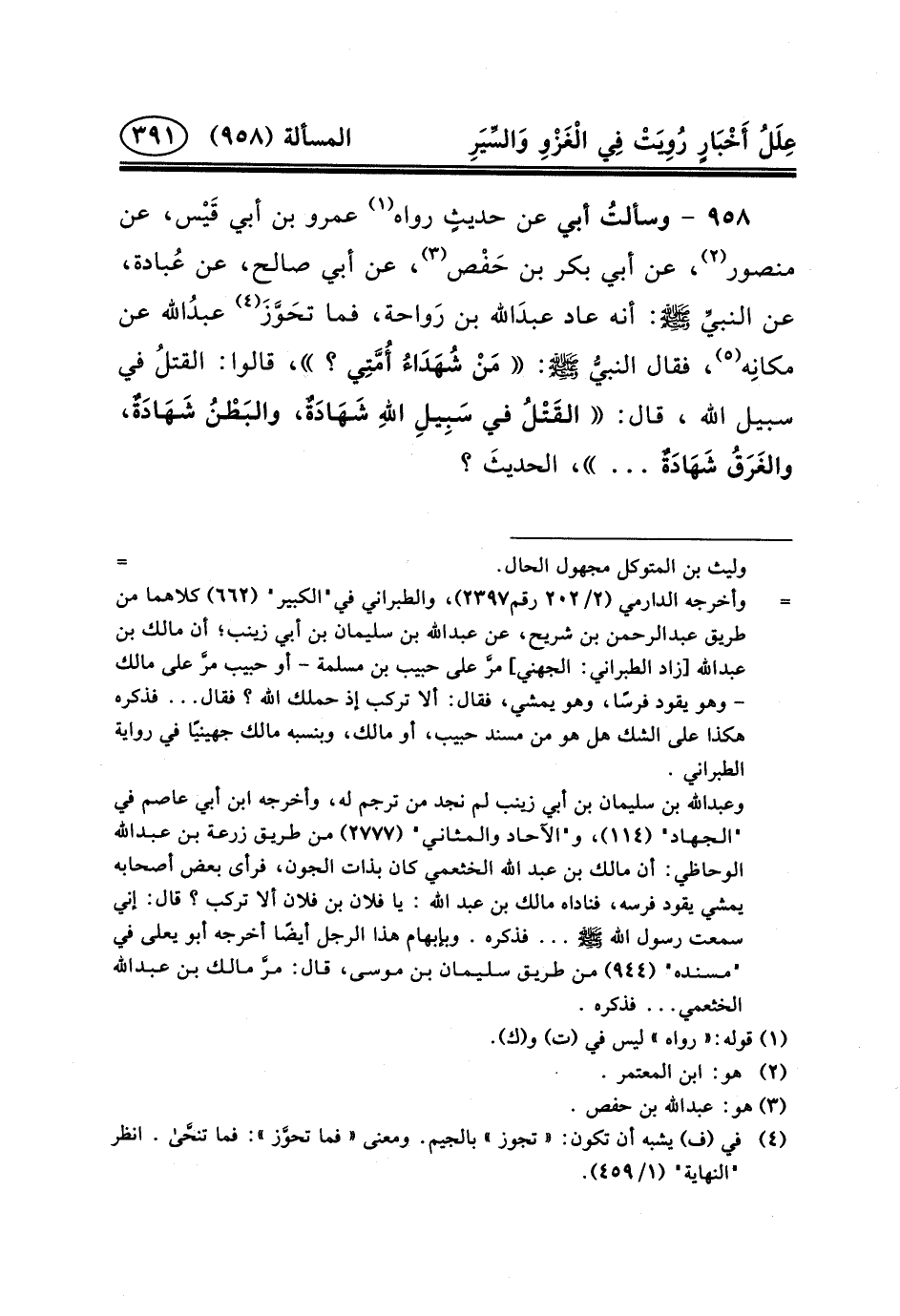 ٩٥٨ - وسألتُ أَبِي عَنْ حديثٍ رَوَاهُ (١) عَمْرو بْن أَبِي قَيْس، عَن مَنْصُورٍ (٢) ، عَنْ أَبِي بَكْرِ بْنِ حَفْص (٣) ، عَنْ أَبِي صَالِحٍ، عَنْ عُبادة، عن النبيِّ (ص) : أنه عاد عبدَالله بن رَواحة، فما تحَوَّزَ (٤) عبدُالله عن مكانِه (٥) ، فقال النبيُّ (ص) : مَنْ شُهَدَاءُ أُمَّتِي؟ ، قَالُوا: القتلُ فِي سَبِيلِ اللَّهِ، قَالَ: القَتْلُ فِي سَبِيلِ اللهِ شَهَادَةٌ، والبَطْنُ شَهَادَةٌ، والغَرَقُ شَهَادَةٌ ... ، الحديثَ؟