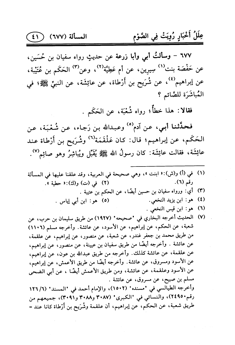 فحدَّثنا أبي، عن آدم (٧) وعبد الله بْنِ رَجاء، عَنْ شُعْبَة، عَنِ الحَكَم، عَنْ إِبْرَاهِيمَ؛ قَالَ: كَانَ عَلْقَمَة (٨) وشُرَيح بْنُ أَرْطاة عِنْدَ عائِشَة، فَقَالَتْ عائِشَة: كَانَ رسولُ الله (ص) يُقَبِّل ويُباشِرُ وهو صائِم (٩) .