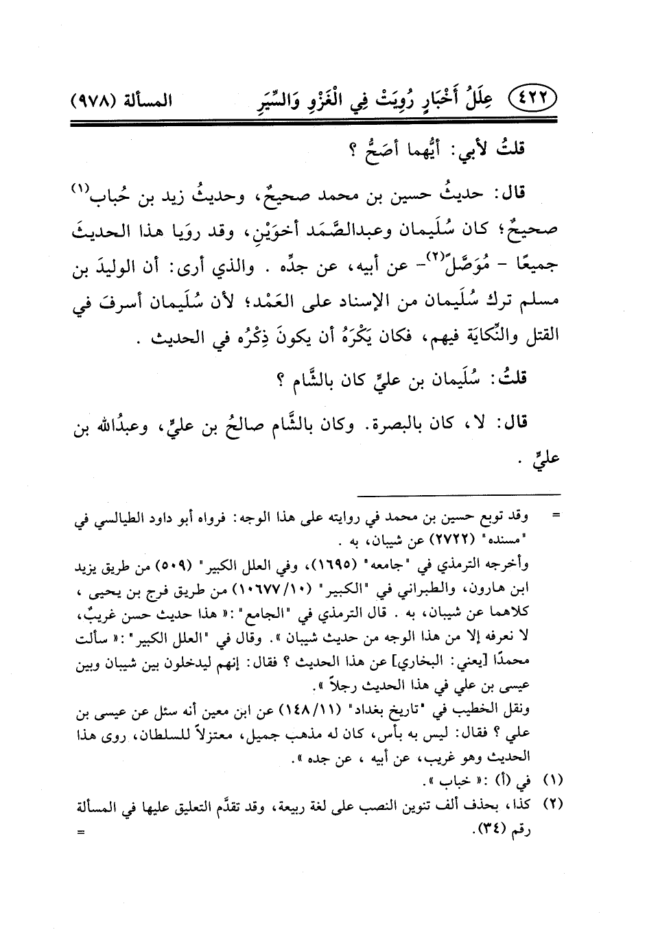قَالَ: حديثُ حُسَيْنِ بْنِ مُحَمَّدٍ صحيحٌ، وحديثُ زَيْدِ بْنِ حُباب (١) صحيحٌ؛ كان سُلَيمان وعبد الصَّمَد أخوَيْنِ، وَقَدْ روَيا هَذَا الحديثَ جميعًا - مُوَصَّلً (٢) - عَنْ أَبِيهِ، عَنْ جدِّه. وَالَّذِي أَرَى: أَنَّ الوليدَ بْنَ مُسْلِمٍ تَرَكَ سُلَيمان مِنَ الإِسْنَادِ عَلَى العَمْد؛ لأَنَّ سُلَيمان أسرفَ فِي الْقَتْلِ والنِّكايَة فِيهِمْ، فَكَانَ يَكْرَهُ أَنْ يكونَ ذِكْرُه فِي الْحَدِيثِ.