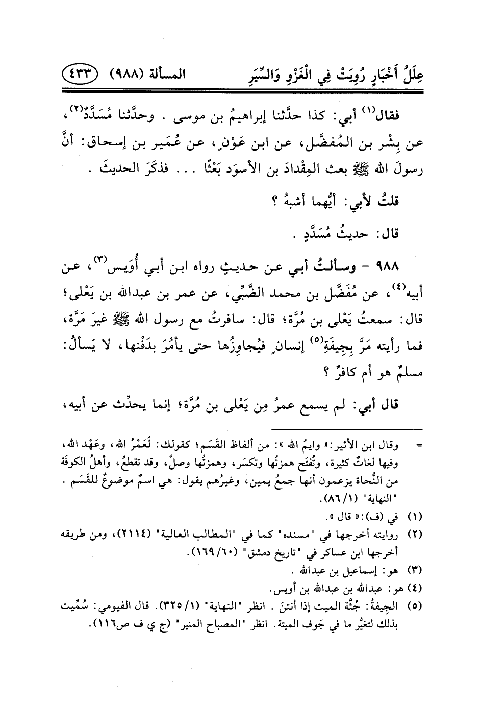 ٩٨٨ - وسألتُ أَبِي عَنْ حديثٍ رَوَاهُ ابْنُ أَبِي أُوَيس (٣) ، عَنْ أَبِيهِ (٤) ، عَنْ مُفَضَّل بْنِ مُحَمَّدٍ الضَّبِّي، عن عمر بن عبد الله بْنِ يَعْلى؛ قَالَ: سمعتُ يَعْلى بْنَ مُرَّة؛ قَالَ: سافرتُ مَعَ رسول الله (ص) غيرَ مَرَّة، فَمَا رَأَيْتُهُ مَرَّ بِجِيفَةِ (٥) إنسان ٍ فيُجاوِزُها حَتَّى يأمُرَ بدَفْنها، لا يَسألُ: مسلمٌ هُوَ أَمْ كافرٌ؟