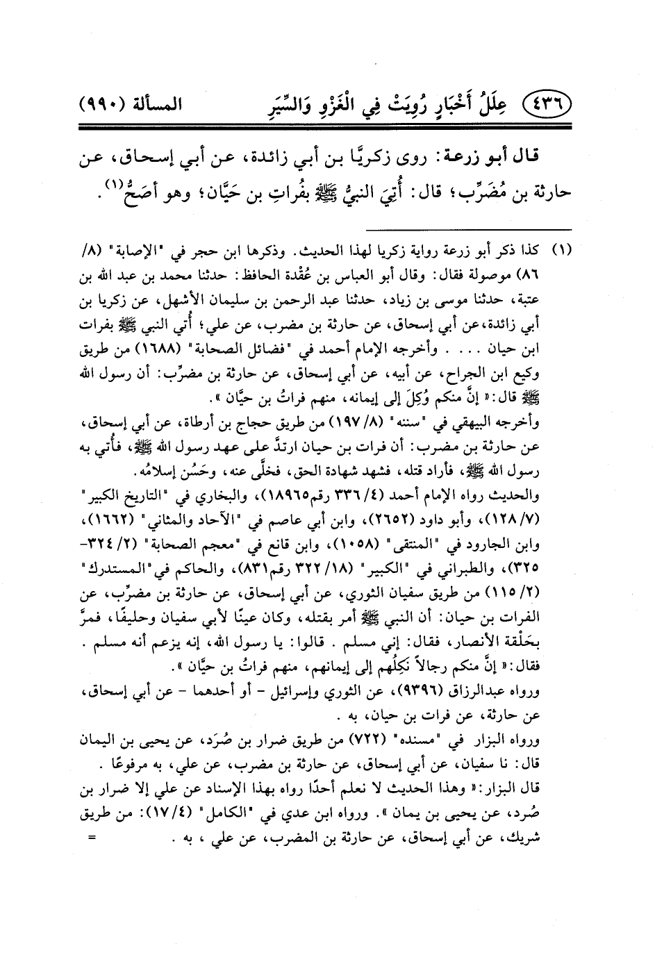 (١) كذا ذكر أبو زرعة رواية زكريا لهذا الحديث. وذكرها ابن حجر في "الإصابة" (٨/٨٦) موصولة فقال: وقال أبو العباس بن عُقْدة الحافظ: حَدَّثَنَا مُحَمَّدُ بْنُ عَبْدِ اللَّهِ ابن عتبة، حدثنا موسى بن زياد، حدثنا عبد الرحمن بن سليمان الأشهل، عَنْ زَكَرِيَّا بْنِ أَبِي زَائِدَةَ، عَنْ أَبِي إِسْحَاقَ، عَن حارثة بن مضرب، عن علي؛ أُتي النبي (ص) بفرات بن حيان ... . وأخرجه الإمام أحمد في "فضائل الصحابة" (١٦٨٨) من طريق وكيع ابن الجراح، عَنْ أَبِيهِ، عَنْ أَبِي إِسْحَاقَ، عن حارثة بن مضرِّب: أن رسول الله (ص) قال: «إنَّ منكم وُكِلَ إلى إيمانه، منهم فراتُ بن حيَّان» .