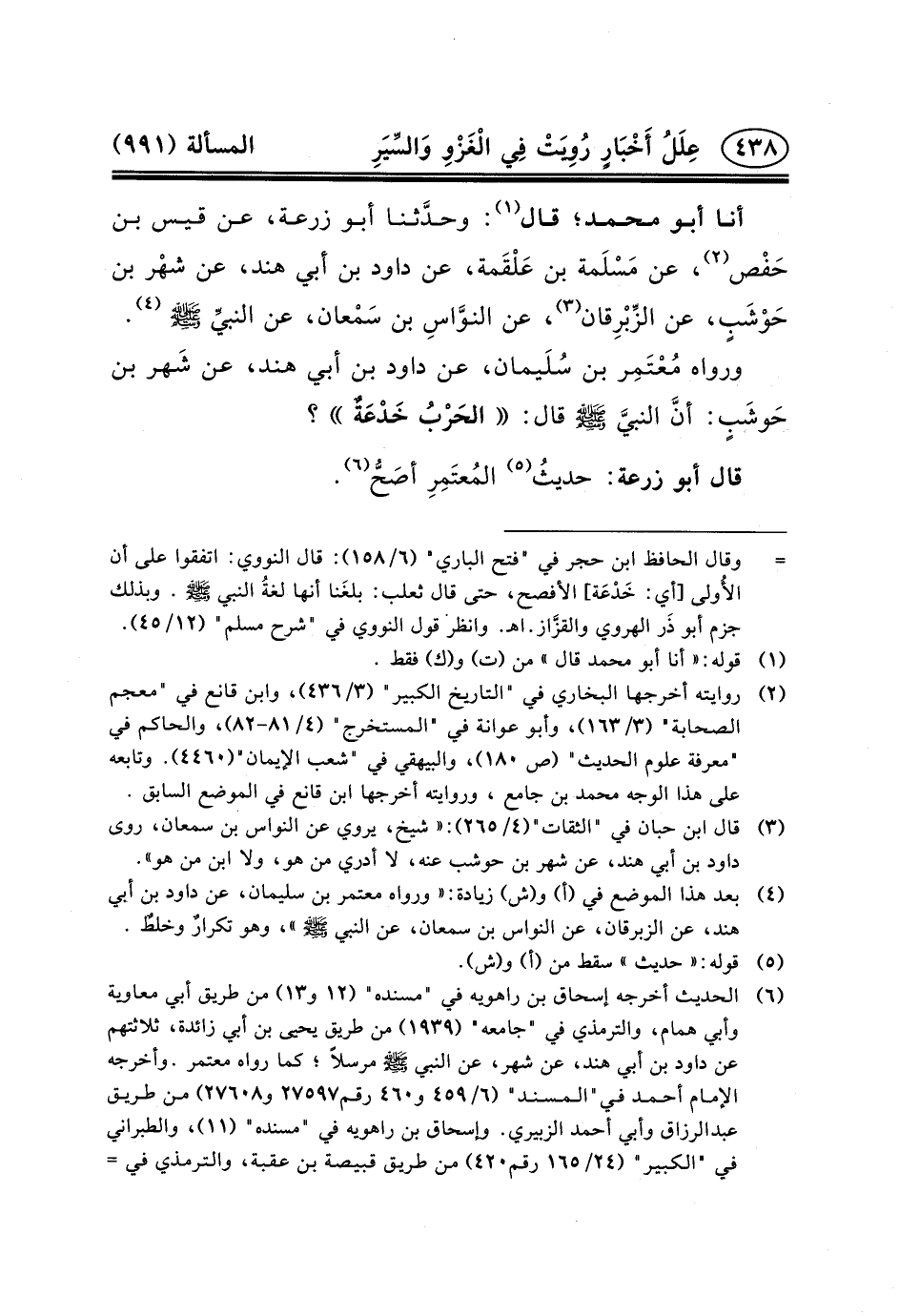 وَرَوَاهُ مُعْتَمِر بْنُ سُلَيمان، عَنْ دَاوُدُ بْنُ أَبِي هِنْدٍ، عَنْ شَهر بْنِ حَوشَبٍ: أنَّ النبيَّ (ص) قَالَ: الحَرْبُ خَدْعَةٌ؟