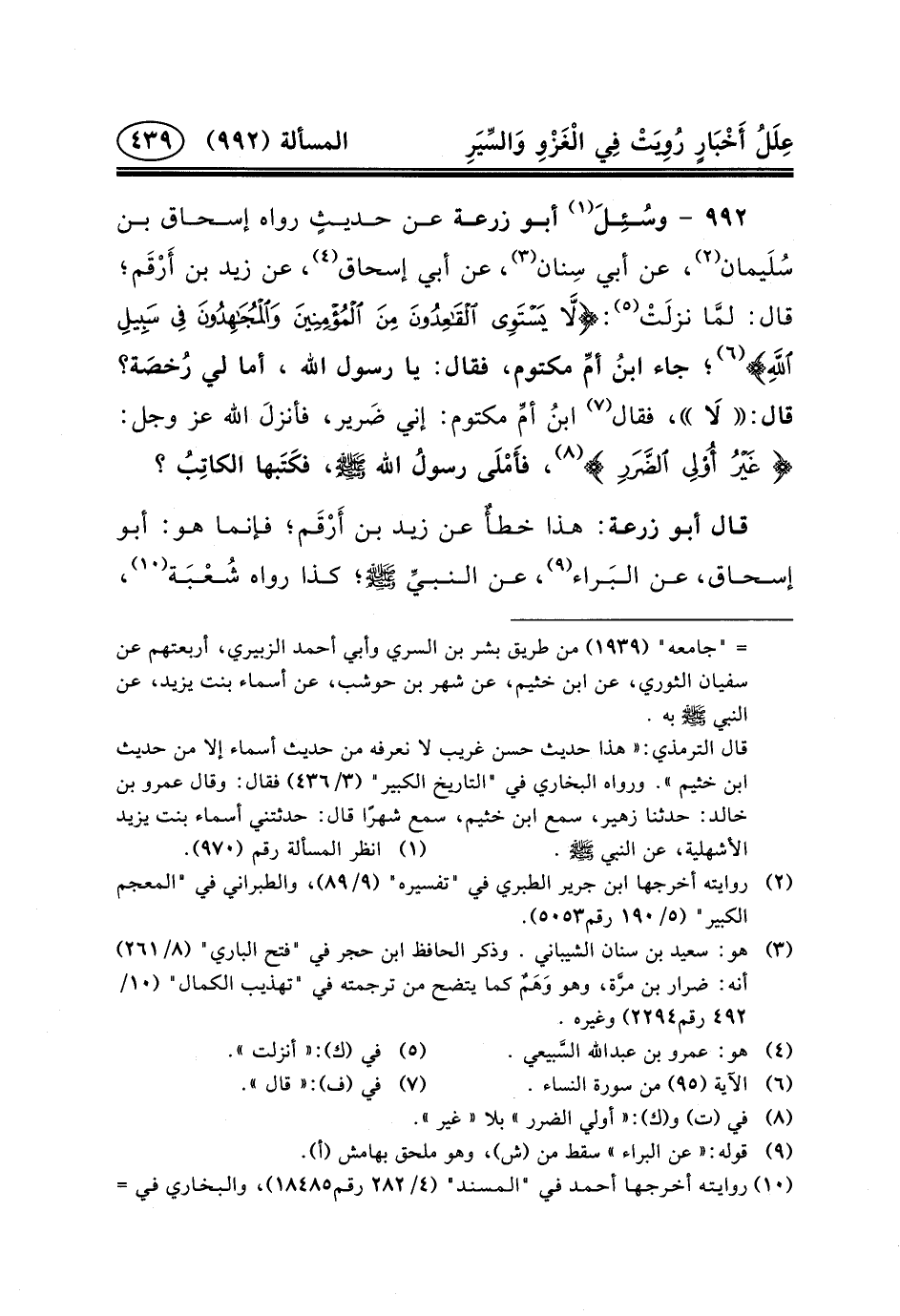 ٩٩٢ - وسُئِلَ (١) أَبُو زُرْعَةَ عَنْ حديثٍ رَوَاهُ إِسْحَاقُ بْنُ سُلَيمان (٢) ، عَنْ أَبِي سِنان (٣) ، عَنْ أَبِي إِسْحَاقَ (٤) ، عَنْ زَيْدِ بْنِ أَرْقَم؛ قَالَ: لمَّا نزلَتْ (٥) : {لَا ... } (٦) ؛ جَاءَ ابنُ أمِّ مَكْتُومٍ، فَقَالَ: يَا رَسُولَ اللَّهِ، أَمَا لِي رُخصَة؟ قَالَ: لَا، فَقَالَ (٧) ابنُ أمِّ مَكْتُومٍ: إِنِّي ضَرير، فأنزلَ الله عز وجل: {لَا ... } (٨) ، فأَمْلَى رسولُ الله (ص) ، فكَتَبها الكاتِبُ؟