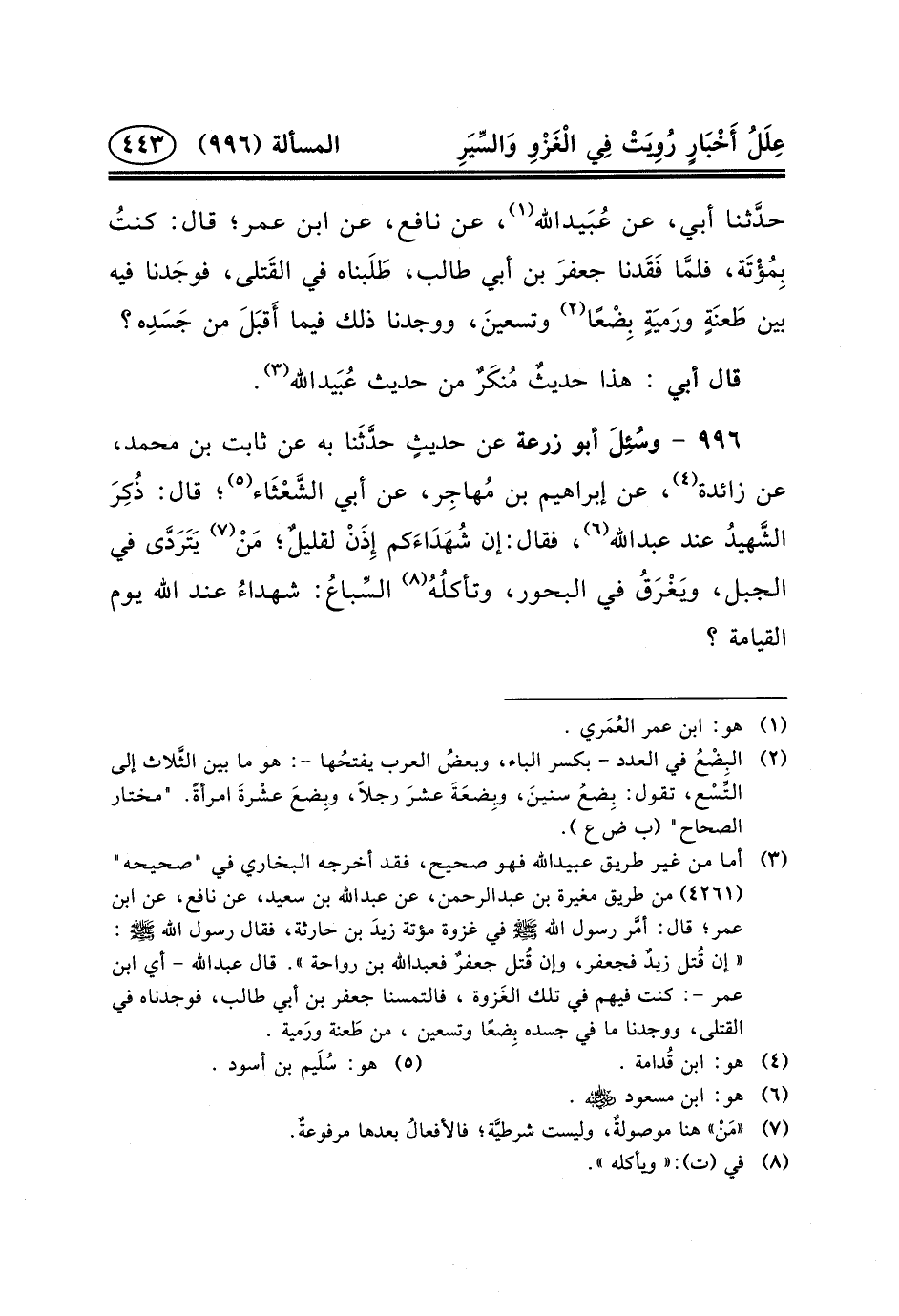 حدَّثنا أبي، عن عُبَيدالله (١) ، عَنْ نَافِعٍ، عَنِ ابْنِ عُمَرَ؛ قَالَ: كنتُ بِمُؤْتَة، فلمَّا فَقَدنا جعفرَ بْنَ أَبِي طَالِبٍ، طَلَبناه فِي القَتلى، فوجَدنا فِيهِ بَيْنَ طَعنَةٍ ورَميَةٍ بِضْعًا (٢) وتسعينَ، وَوَجَدْنَا ذَلِكَ فِيمَا أَقبَلَ مِنْ جَسَدِه؟