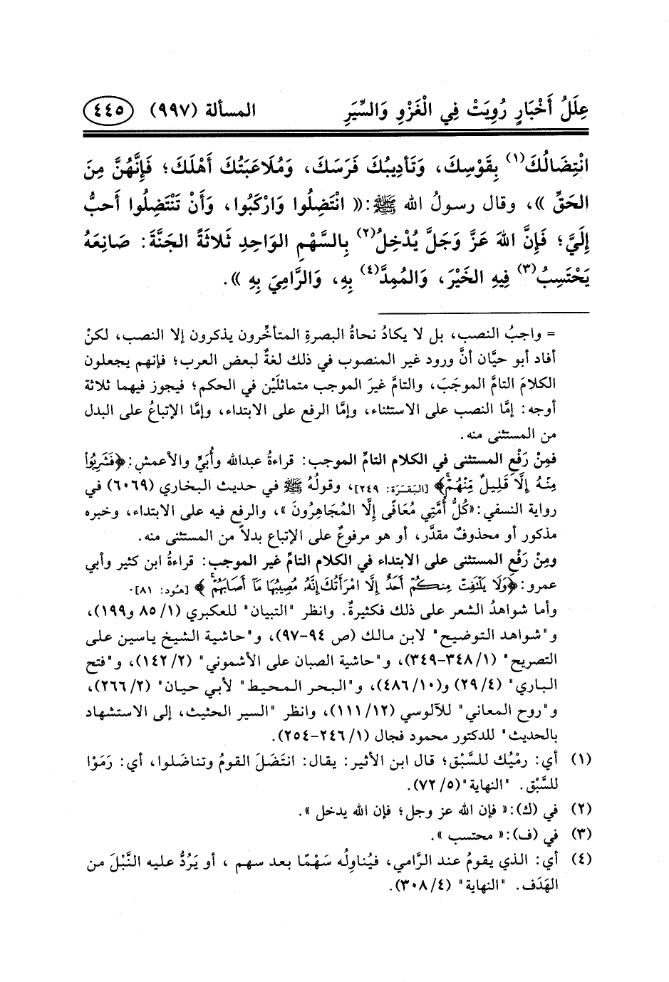 انْتِضَالُكَ (١) بِقَوْسِكَ، وَتَأدِيبُكَ فَرَسَكَ، وَمُلَاعَبَتُكَ أَهْلَكَ؛ فَإِنَّهُنَّ مِنَ الحَقِّ، وَقَالَ رسولُ الله (ص) : انْتَضِلُوا وَارْكَبُوا، وَأَنْ تَنْتَضِلُوا أَحبُّ إِلَيَّ؛ فَإِنَّ اللهَ عَزَّ وَجَلَّ يُدْخِلُ (٢) بِالسَّهْمِ الوَاحِدِ ثَلاثَةً الجَنَّةَ: صَانِعَهُ يَحْتَسِبُ (٣) فِيهِ الخَيْرَ، وَالمُمِدَّ (٤) بِهِ، وَالرَّامِيَ بِهِ.