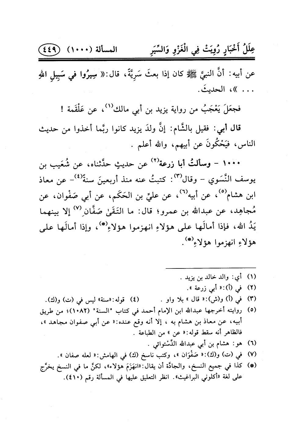 ١٠٠٠ - وسألتُ أَبَا زُرْعَةَ (٢) عَنْ حديثٍ حدَّثناه، عَنْ شُعَيب بْنِ يُوسُفَ النَّسَوي - وَقَالَ (٣) : كتبتُ عنه منذ أربعينَ سنةً (٤) - عَنْ مُعَاذِ بْنِ هِشَامٍ (٥) ، عَنْ أَبِيهِ (٦) ، عَنْ عليِّ بْنِ الحَكَم، عَنْ أَبِي صَفْوان، عَنْ مُجاهِد، عن عبد الله بْنِ عَمْرٍو؛ قَالَ: مَا التَقَى صَفَّان ِ (٧) إِلا بَيْنَهُمَا يَدُ اللَّهِ، فَإِذَا أمالَها عَلَى هؤلاءِ انْهَزَمُوا هؤلاءِ (*) ، وَإِذَا أمالَها عَلَى هؤلاءِ انْهَزَمُوا هؤلاءِ (*) .
