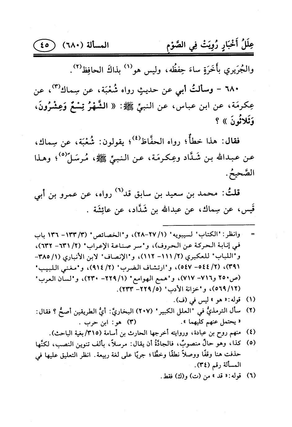 ٦٨٠ - وسألتُ أَبِي عَنْ حديثٍ رَوَاهُ شُعْبَة، عَنْ سِماك (٣) ، عَنْ عِكرمَة، عَنِ ابْنِ عباس، عن النبيِّ (ص) : الشَّهْرُ تِسْعٌ وَعِشْرُونَ، وَثَلاثُونَ؟