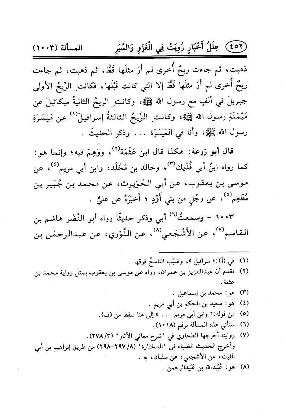 ١٠٠٣ - وسمعتُ (٦) أَبِي وَذَكَرَ حَدِيثًا رَوَاهُ أَبُو النَّضْر هاشم بْنُ الْقَاسِمِ (٧) ، عَنِ الأَشْجَعي (٨) ، عَنِ الثَّوْري، عن عبد الرحمن ابن