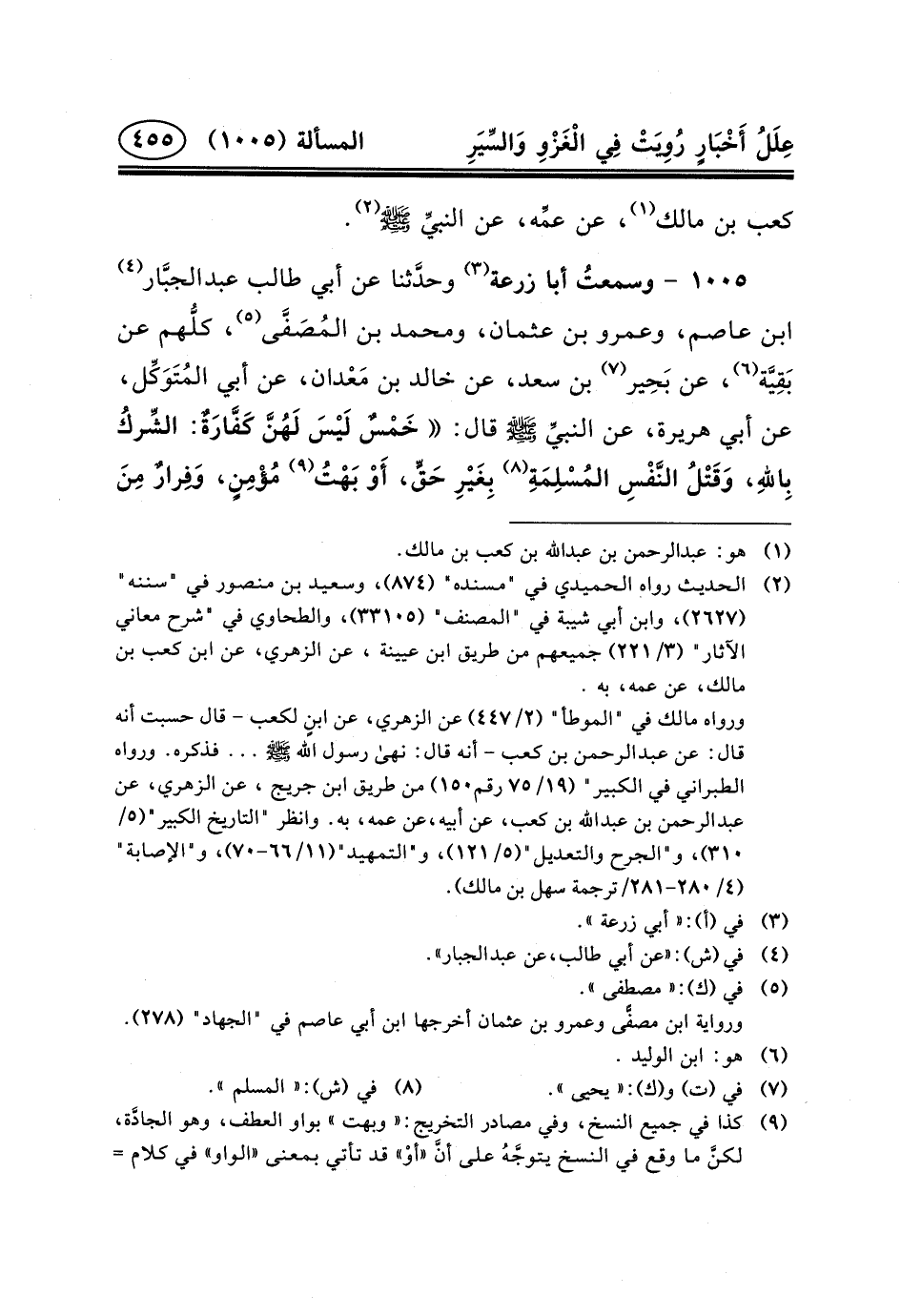 كلُّهم عَنْ بَقِيَّة (٦) ، عَنْ بَحِير (٧) بْنِ سعد، عن خالد ابن مَعْدان، عَنْ أَبِي المُتَوَكِّل، عَنْ أبي هريرة، عن النبيِّ (ص) قَالَ: خَمْسٌ لَيْسَ لَهُنَّ كَفَّارَةٌ: الشِّركُ بِاللهِ، وَقَتْلُ النَّفْسِ المُسْلِمَةِ (٨) بِغَيْرِ حَقٍّ، أَوْ بَهْتُ (٩) مُؤْمِنٍ، وَفِرارٌ مِنَ