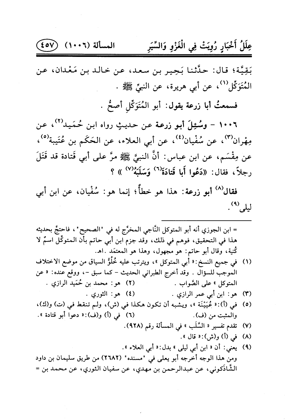 ١٠٠٦ - وسُئِلَ أَبُو زُرْعَةَ عَنْ حديثٍ رَوَاهُ ابْنُ حُمَيد (٢) ، عَنْ مِهْران (٣) ، عَنْ سُفْيان (٤) ، عَنْ أَبِي الْعَلاءِ، عَنِ الحَكَم بْنِ عُتَيبة (٥) ، عَنْ مِقْسَم، عَنِ ابْنِ عباس: أنَّ النبيَّ (ص) مرَّ عَلَى أَبِي قَتادة قَدْ قَتَلَ رَجُلا، فَقَالَ: دَعُوا أَبا قَتادَةَ (٦) وَسَلَبَهُ (٧) ؟