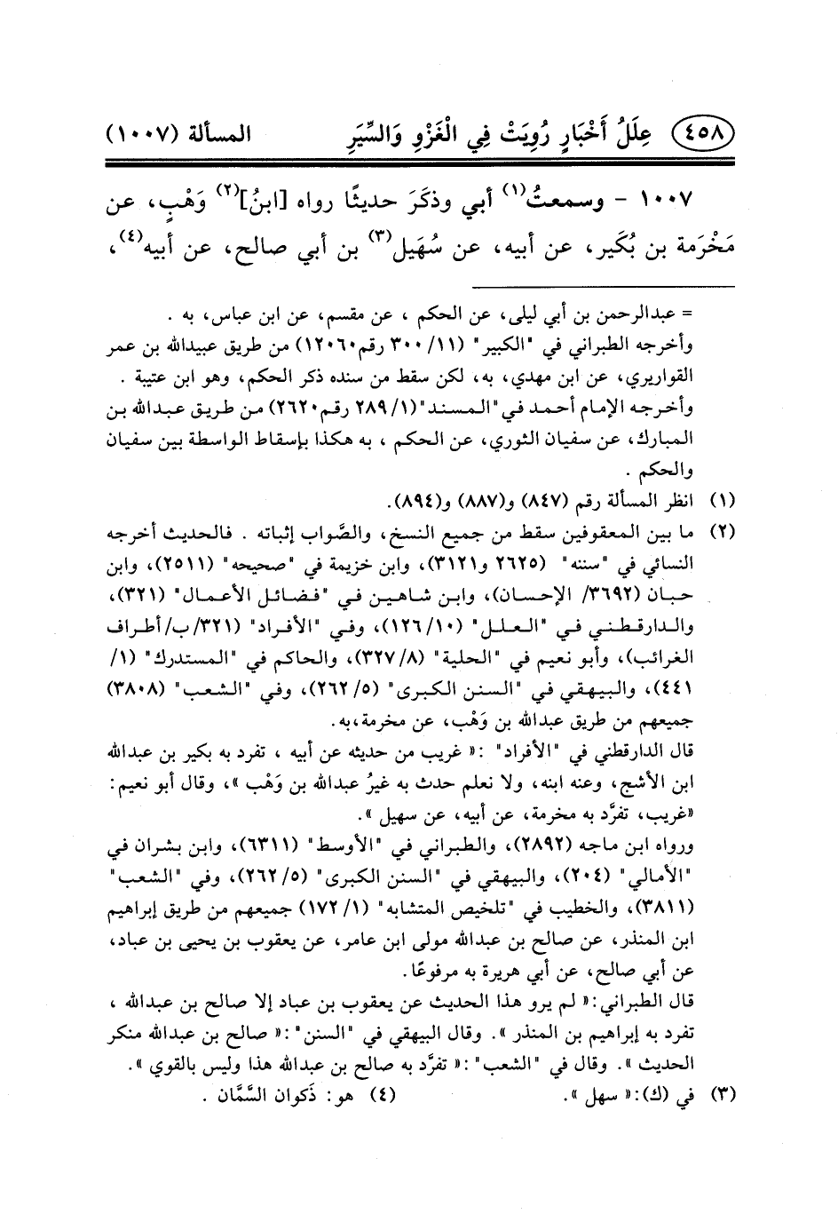 ١٠٠٧- وسمعتُ (١) أَبِي وذكَرَ حَدِيثًا رَوَاهُ [ابنُ] (٢) وَهْبٍ، عَنْ مَخْرَمة بْنِ بُكَير، عَنْ أَبِيهِ، عَنْ سُهَيل (٣) بْنِ أبي صالح، عن أبيه (٤) ،