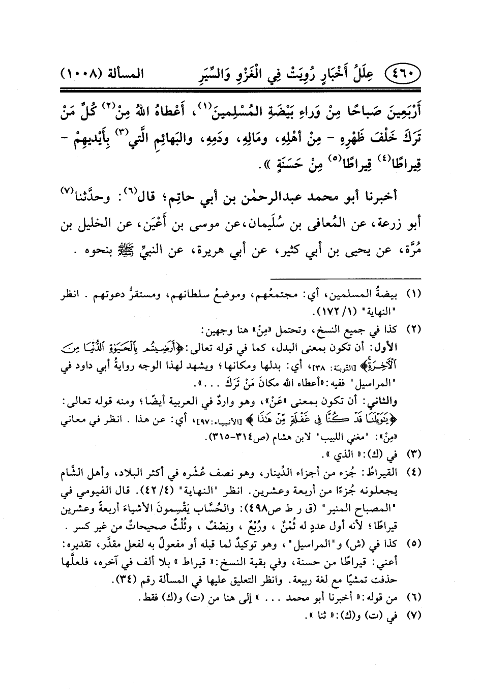 (٥) كذا في (ش) و"المراسيل"، وهو توكيدٌ لما قبله أو مفعولٌ به لفعل مقدَّر، تقديره: أعني: قيراطًا من حسنة، وفي بقية النسخ: «قيراط» بلا ألف في آخره، فلعلَّها حذفت تمشيًا مع لغة ربيعة. وانظر التعليق عليها في المسألة رقم (٣٤) .