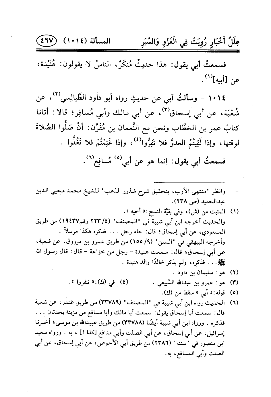 ١٠١٤ - وسألتُ أَبِي عَنْ حديثٍ رَوَاهُ أَبُو دَاوُدَ الطَّيالِسي (٢) ، عَنْ شُعْبَة، عَنْ أَبِي إِسْحَاقَ (٣) ، عَنْ أَبِي مَالِكٍ وَأَبِي مُسافِر؛ قَالا: أَتَانَا كتابُ عُمَرَ بْنِ الخطَّاب ونحن مع النُّعمان ابن مُقَرِّن: أنْ صَلُّوا الصَّلاةَ لِوَقْتِهَا، وَإِذَا لَقِيتُمُ العدوَّ فَلا تَفِرُّوا (٤) ، وَإِذَا غَنِمْتُمْ فَلا تَغُلُّوا.