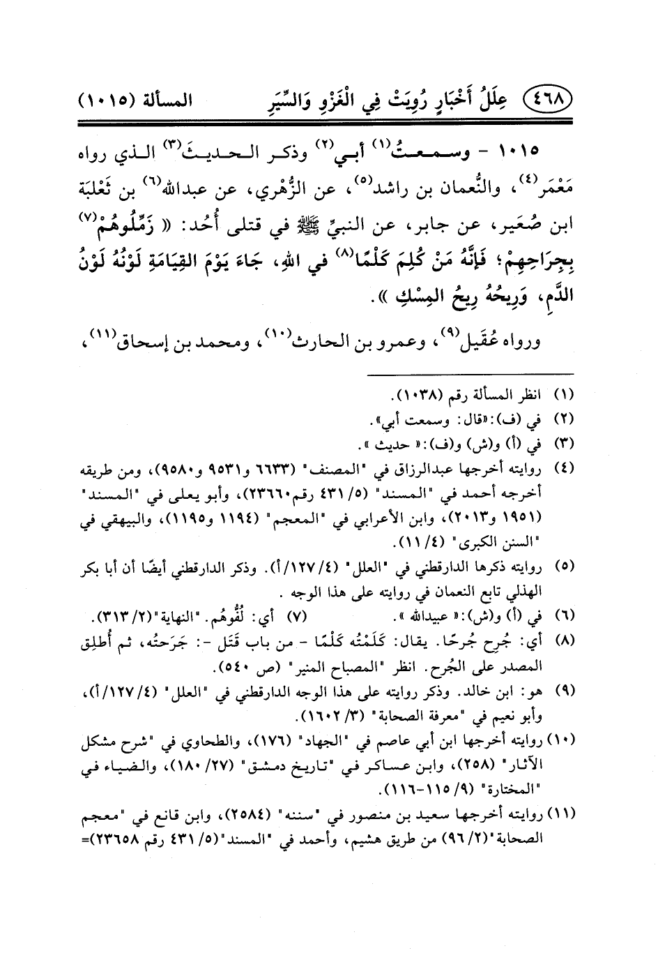 ١٠١٥ - وسمعتُ (١) أَبِي (٢) وَذَكَرَ الحديثَ (٣) الَّذِي رَوَاهُ مَعْمَر (٤) ، والنُّعمان بْنُ رَاشِدٍ (٥) ، عن الزُّهْري، عن عبد الله (٦) بن ثَعْلبَة ابن صُعَير، عَنْ جَابِرٍ، عَنِ النبيِّ (ص) فِي قَتْلَى أُحُد: زَمِّلُوهُمْ (٧) بِجِرَاحِهِمْ؛ فَإنَّهُ مَنْ كُلِمَ كَلْمًا (٨) فِي اللهِ، جَاءَ يَوْمَ القِيَامَةِ لَوْنُهُ لَوْنُ الدَّمِ، وَرِيحُهُ رِيحُ المِسْكِ.