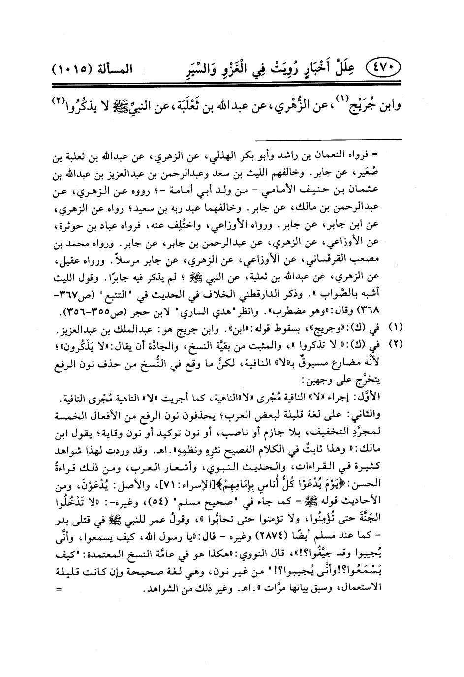 وَابْنُ جُرَيْج (١) ، عَنِ الزُّهْري، عَنْ عبد الله ابن ثَعْلَبَة، عن النبيِّ (ص) لا يذكُرُوا (٢)