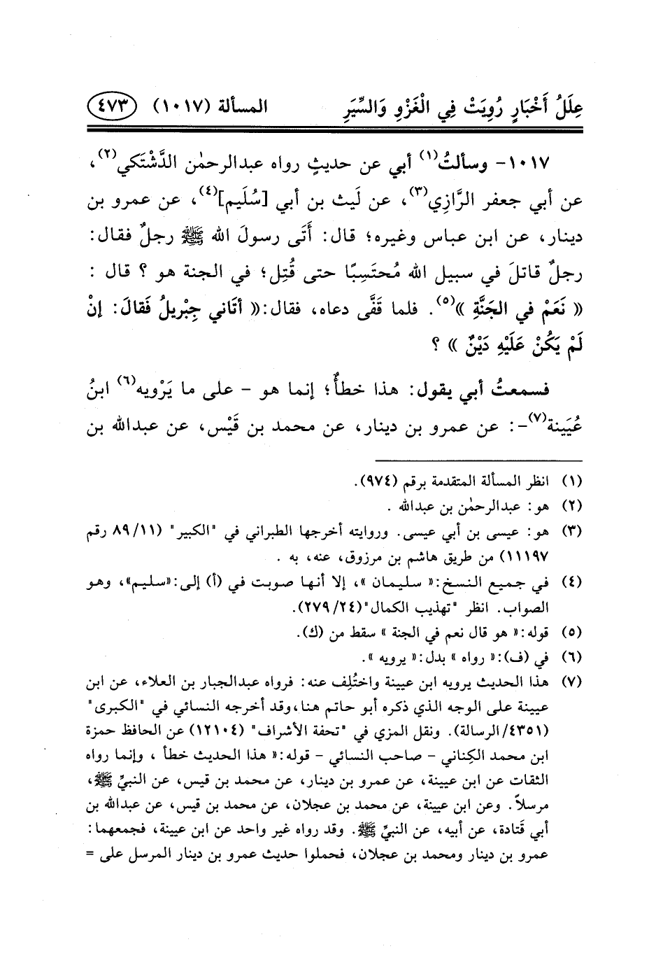 ١٠١٧- وسألتُ (١) أَبِي عَنْ حديثٍ رَوَاهُ عبد الرحمن الدَّشْتَكي (٢) ، عَنْ أَبِي جَعْفَرٍ الرَّازِي (٣) ، عَنْ لَيث بْنِ أَبِي [سُلَيم] (٤) ، عَنْ عَمْرِو بْنِ دِينَارٍ، عَنْ ابْنِ عَبَّاسٍ وَغَيْرِهِ؛ قَالَ: أَتَى رسولَ الله (ص) رجلٌ فَقَالَ: رجلٌ قاتلَ فِي سَبِيلِ اللَّهِ مُحتَسِبًا حَتَّى قُتِل؛ فِي الْجَنَّةِ هُوَ؟ قَالَ: نَعَمْ فِي الجَنَّةِ (٥) . فَلَمَّا قَفَّى دَعَاهُ، فَقَالَ: أتَاني جِبْريلُ فَقالَ: إنْ لَمْ يَكُنْ عَلَيْهِ دَيْنٌ؟