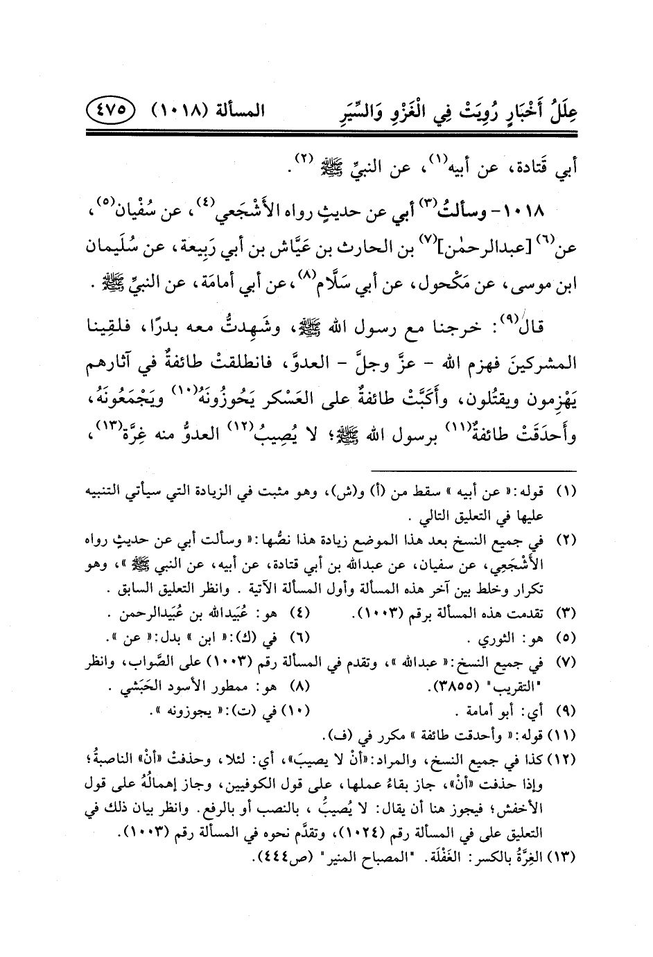 (٢) في جميع النسخ بعد هذا الموضع زيادة هذا نصُّها: «وَسَأَلْتُ أَبِي عَنْ حديثٍ رَوَاهُ الأَشْجَعِي، عن سفيان، عن عبد الله بْنِ أَبِي قَتَادَةَ، عَنْ أَبِيهِ، عن النبي (ص) » ، وهو تكرار وخلط بين آخر هذه المسألة وأول المسألة الآتية. وانظر التعليق السابق.