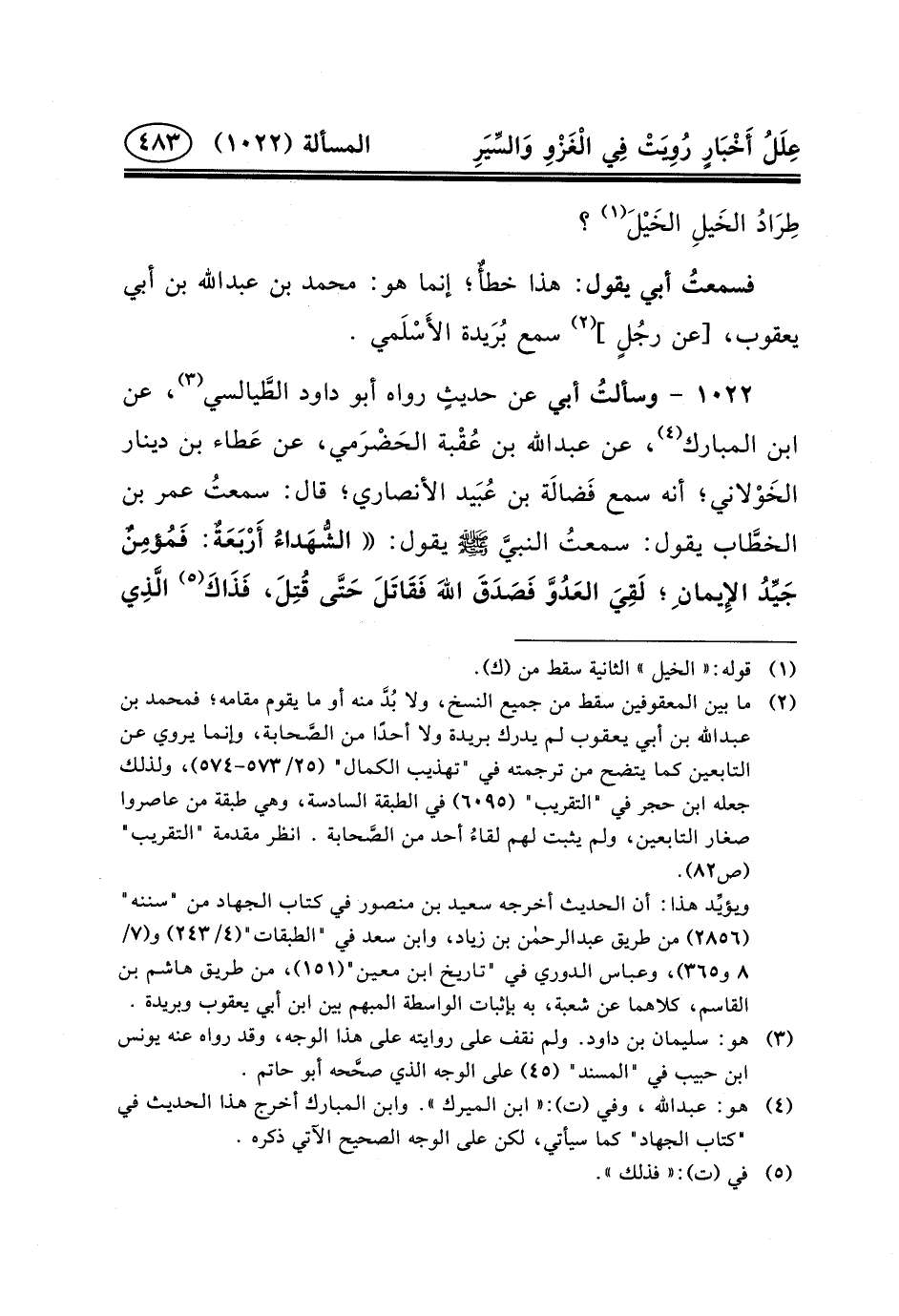 ١٠٢٢ - وسألتُ أَبِي عَنْ حديثٍ رَوَاهُ أَبُو دَاوُدَ الطَّيالسي (٣) ، عَنِ ابْنِ الْمُبَارَكِ (٤) ، عَنْ عبد الله بْنِ عُقْبة الحَضْرَمي، عَنْ عَطاء بن دينار الخَوْلاني؛ أَنَّهُ سَمِعَ فَضالَة بْنَ عُبَيد الأَنْصَارِيَّ؛ قَالَ: سمعتُ عُمَرَ بْنَ الخطَّاب يَقُولُ: سمعتُ النبيَّ (ص) يَقُولُ: الشُّهَداءُ أَرْبَعَةٌ: فَمُؤمِنٌ جَيِّدُ الإِيمان ِ؛ لَقِيَ العَدُوَّ فَصَدَقَ اللهَ فَقَاتَلَ حَتَّى قُتِلَ، فَذَاكَ (٥) الَّذِي