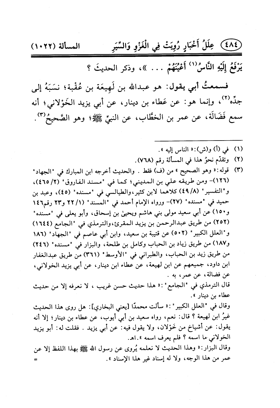 فسمعتُ أَبِي يَقُولُ: هو عبد الله بْنُ لَهِيعَة بْنِ عُقْبة؛ نسَبَهُ إِلَى جدِّه (٢) ، وَإِنَّمَا هُوَ: عَنْ عَطاء ابن دِينَارٍ، عَنْ أَبِي يَزِيدَ الخَوْلاني؛ أَنَّهُ سَمِعَ فَضَالَة، عَنْ عُمَرَ بن الخطَّاب، عن النبيِّ (ص) ؛ وهو الصَّحيحُ (٣) .