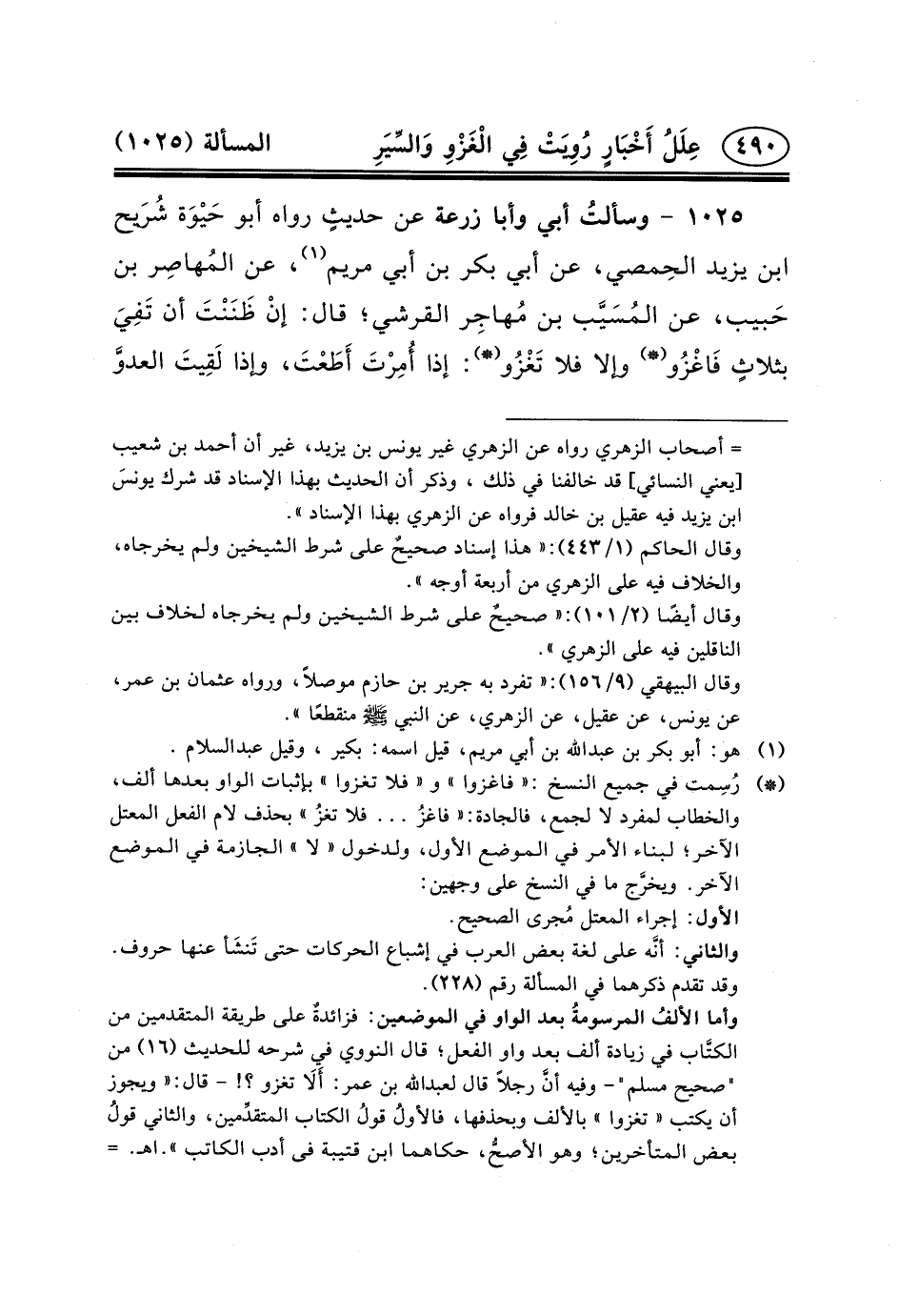 *) ... رُسِمت في جميع النسخ: «فاغزوا» و «فلا تغزوا» بإثبات الواو بعدها ألف، والخطاب لمفرد لا لجمع، فالجادة: «فاغزُ ... فلا تغزُ» بحذف لام الفعل المعتل الآخر؛ لبناء الأمر في الموضع الأول، ولدخول «لا» الجازمة في الموضع الآخر. ويخرَّج ما في النسخ على وجهين: