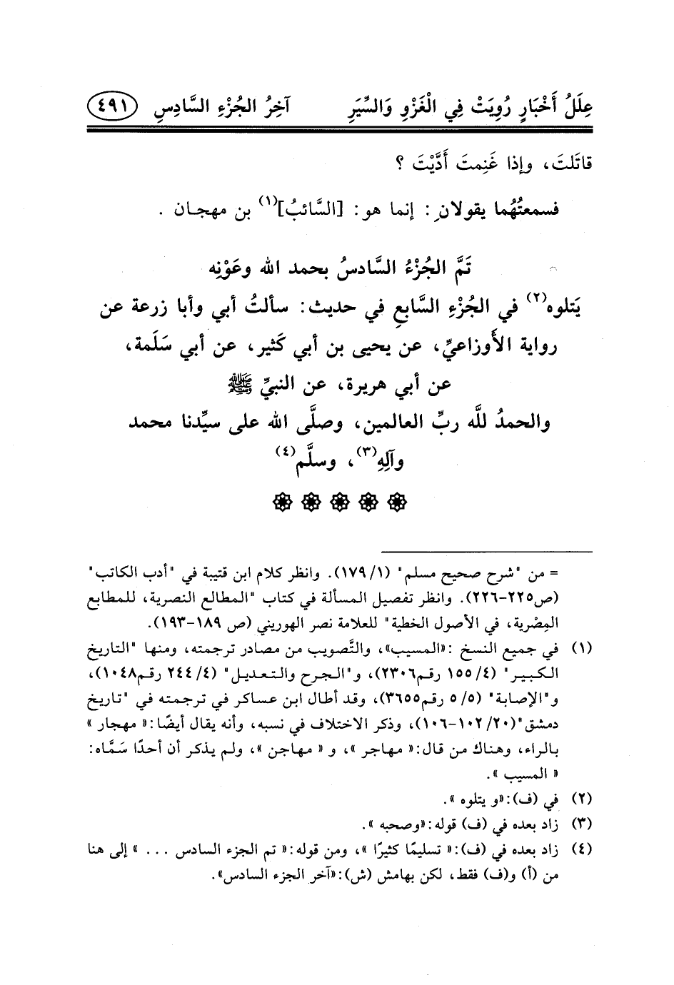 تَمَّ الجُزْءُ السَّادسُ بحمد الله وعَوْنِهيَتلوه (٢) في الجُزْءِ السَّابعِ في حديث: سألتُ أَبِي وَأَبَا زُرْعَةَ عَنْ رِوَايَةِ الأَوزاعيِّ، عَنْ يَحْيَى بْنِ أَبِي كَثير، عَنْ أَبِي سَلَمة، عَنْ أَبِي هُرَيْرَةَ، عَنِ النبيِّ (ص) والحمدُ للَّه ربِّ العالمين، وصلَّى الله على سيِّدنا محمدوآلِهِ (٣) ، وسلَّم