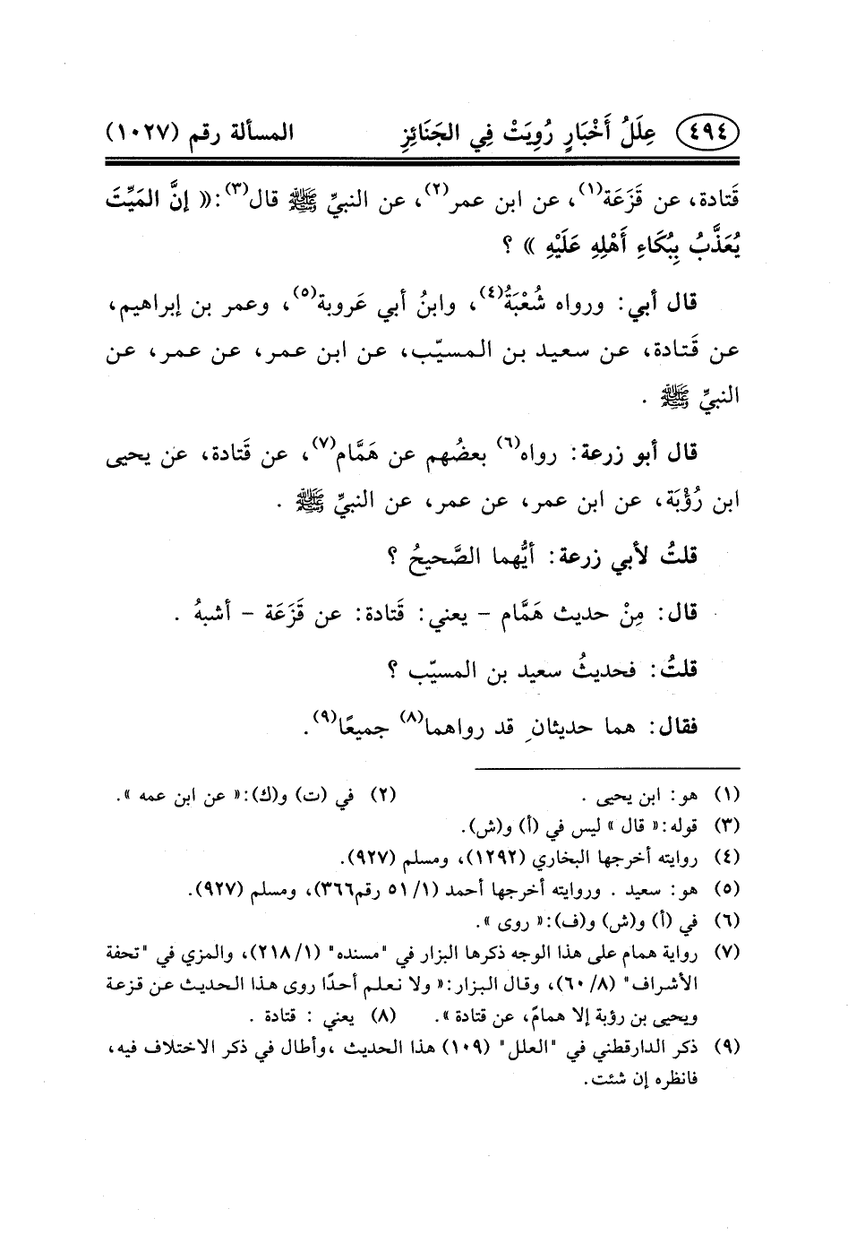 قَالَ أَبُو زُرْعَةَ: رَوَاهُ (٦) بعضُهم عَن هَمَّام (٧) ، عَنْ قَتادة، عَنْ يَحْيَى بْنِ رُؤْبَة، عَنِ ابْنِ عُمَرَ، عَنْ عُمَرَ، عَنِ النبيِّ (ص) .