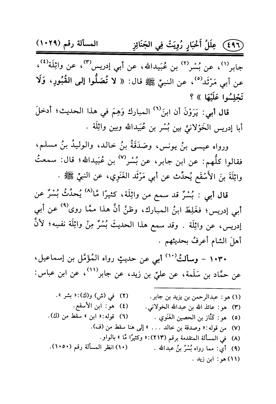 جابر (١) ، عن بُسْر (٢) بن عُبَيدالله، عَنْ أَبِي إِدْرِيسَ (٣) ، عَنْ واثِلَة (٤) ، عَنْ أَبِي مَرْثَد (٥) ، عَنِ النبيِّ (ص) قَالَ: لا تُصَلُّوا إِلَى القُبُورِ، وَلَا تَجْلِسُوا عَلَيْهَا؟
