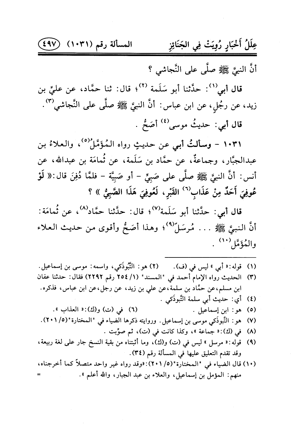 قَالَ أَبِي: حدَّثنا أَبُو سَلَمة (٧) ؛ قَالَ: حدَّثنا حمَّاد (٨) ، عن ثُمامَة: أنَّ النبيَّ (ص) ... مُرسَلً (٩) ؛ وَهَذَا أصَحُّ وَأَقْوَى مِنْ حَدِيثِ العلاء والمُؤَمَّل (١٠) .