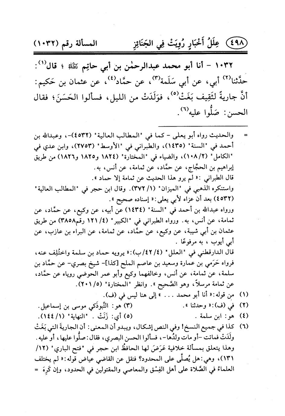 ١٠٣٢ - أنا أبو محمد عبد الرحمن بن أبي حاتِم _ح؛ قَالَ (١) : حدَّثنا (٢) أَبِي، عَنْ أَبِي سَلَمة (٣) ، عَنْ حمَّاد (٤) ، عَنْ عُثْمَانَ بْنِ حَكيم: أنَّ جَارِيَةً لثَقِيف بَغَتْ (٥) ، فوَلَدَتْ مِنَ اللَّيْلِ، فَسَأَلُوا الحَسَنَ؛ فَقَالَ الْحَسَنُ: صَلُّوا عَلَيْهِ (٦) .