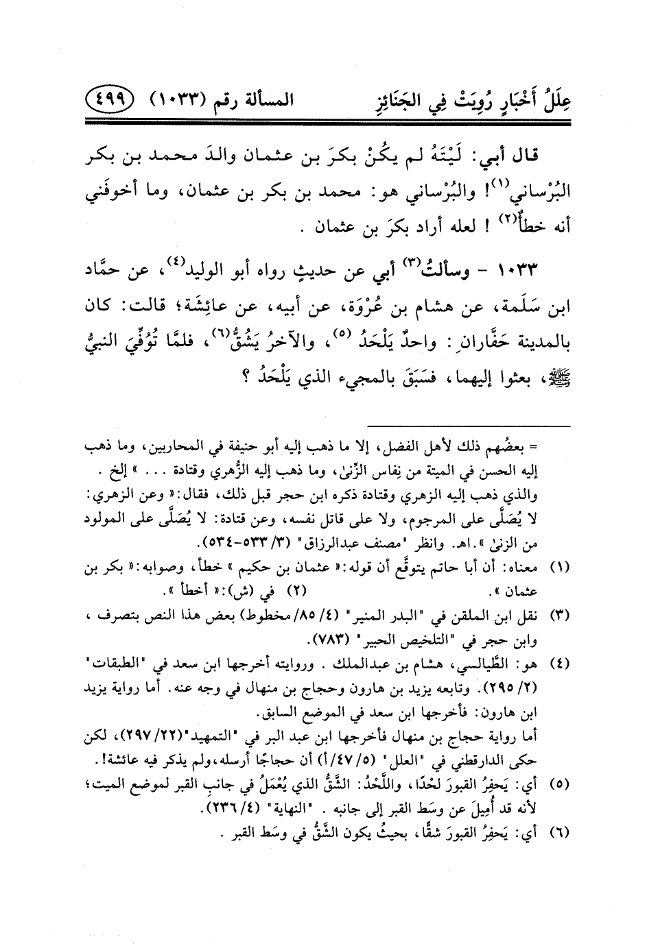 ١٠٣٣- وسألتُ (٣) أَبِي عَن حديثٍ رَوَاهُ أَبُو الوليد (٤) ، عن حمَّاد ابن سَلَمة، عَنْ هِشَامِ بْنِ عُرْوَة، عَنْ أَبِيهِ، عَنْ عائِشَة؛ قَالَتْ: كان بالمدينة حَفَّاران ِ: واحدٌ يَلْحَدُ (٥) ، والآخرُ يَشُقُّ (٦) ، فلمَّا تُوُفِّيَ النبيُّ (ص) ، بَعَثُوا إِلَيْهِمَا، فسَبَقَ بِالْمَجِيءِ الَّذِي يَلْحَدُ؟