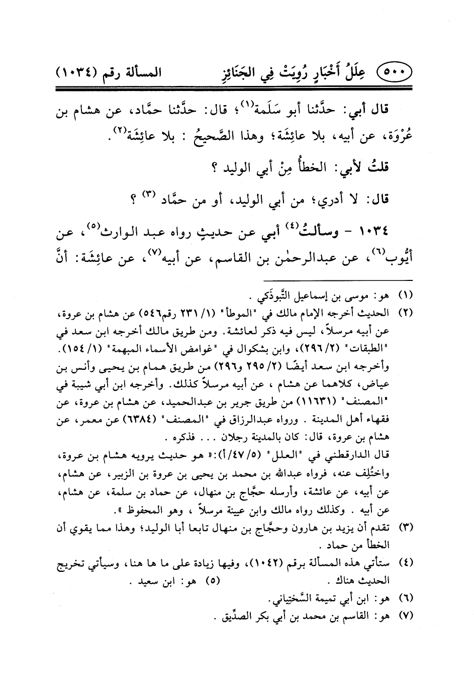 ١٠٣٤ - وسألتُ (٤) أَبِي عَنْ حديثٍ رَوَاهُ عَبْدُ الْوَارِثِ (٥) ، عَنْ أيُّوب (٦) ، عَنْ عبد الرحمن بْنِ الْقَاسِمِ، عَنْ أَبِيهِ (٧) ، عَنْ عائِشَة: أنَّ