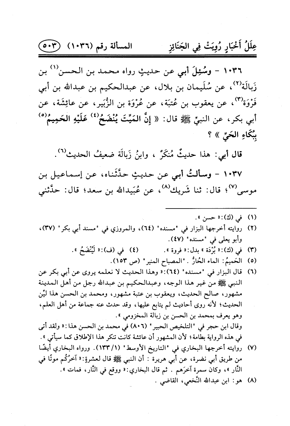 ١٠٣٦ - وسُئِلَ أَبِي عَنْ حديثٍ رَوَاهُ محمد ابن الْحَسَنِ (١) بْنِ زَبالَة (٢) ، عَنْ سُلَيمان بن بلال، عن عبد الحكيم بن عبد الله بْنِ أَبِي فَرْوَة (٣) ، عَنْ يَعْقُوبَ بْنِ عُتبَة، عَنْ عُرْوَة بْنِ الزُّبَير، عَنْ عائِشَة، عَنْ أَبِي بكر، عن النبيِّ (ص) قَالَ: إِنَّ المَيِّتَ يُنْضَحُ (٤) عَلَيْهِ الحَمِيمُ (٥) بِبُكَاءِ الحَيِّ؟