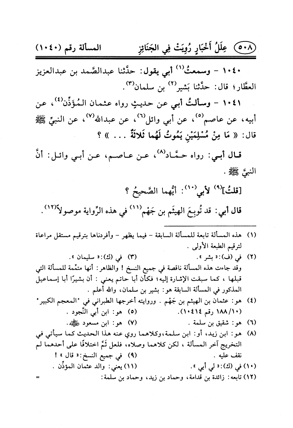 ١٠٤١- وسألتُ أَبِي عَنْ حديثٍ رَوَاهُ عُثْمَانُ المُؤَذِّن (٤) ، عَنْ أَبِيهِ، عَنْ عَاصِمٍ (٥) ، عَنْ أَبِي وَائِلٍ (٦) ، عن عبد الله (٧) ، عن النبيِّ (ص) قَالَ: مَا مِنْ مُسْلِمَيْنِ يَمُوتُ لَهُما ثَلاثَةٌ ... ؟