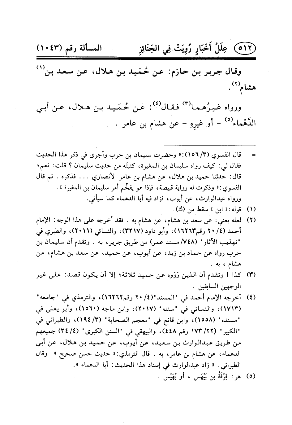 (٤) أخرجه الإمام أحمد في "المسند" (٤/٢٠ رقم ١٦٢٦٢) ، والترمذي في "جامعه" (١٧١٣) ، والنسائي في "سننه" (٢٠١٧) ، وابن ماجه (١٥٦٠) ، وأبو يعلى في "مسنده" (١٥٥٨) ، وابن قانع في "معجم الصحابة" (٣/١٩٤) ، والطبراني في "الكبير" (٢٢/١٧٣ رقم ٤٤٨) ، والبيهقي في "السنن الكبرى" (٤/٣٤) جميعهم من طريق عبد الوارث بن سعيد، عَنْ أَيُّوبَ، عَنْ حُمَيْدِ بْنِ هلال، عن أبي الدهماء، عن هشام بن عامر، به. قال الترمذي: «حديث حسن صحيح» . وقال الطبراني: «زاد عبد الوارث في إسناد هذا الحديث: أبا الدهماء» .