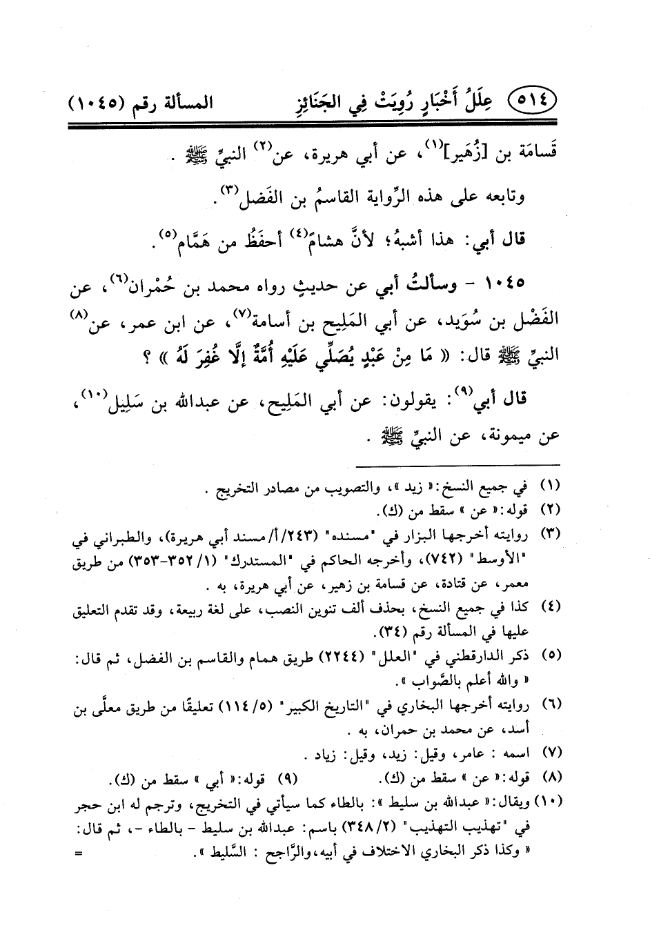 ١٠٤٥ - وسألتُ أَبِي عَنْ حديثٍ رَوَاهُ مُحَمَّدُ بْنُ حُمْران (٦) ، عَنِ الفَضْل بْنِ سُوَيد، عَنْ أَبِي المَلِيح بْنِ أُسَامَةَ (٧) ، عَنِ ابْنِ عمر، عن (٨) النبيِّ (ص) قال: مَا مِنْ عَبْدٍ يُصَلِّي عَلَيْهِ أُمَّةٌ إلَاّ غُفِرَ لَهُ؟