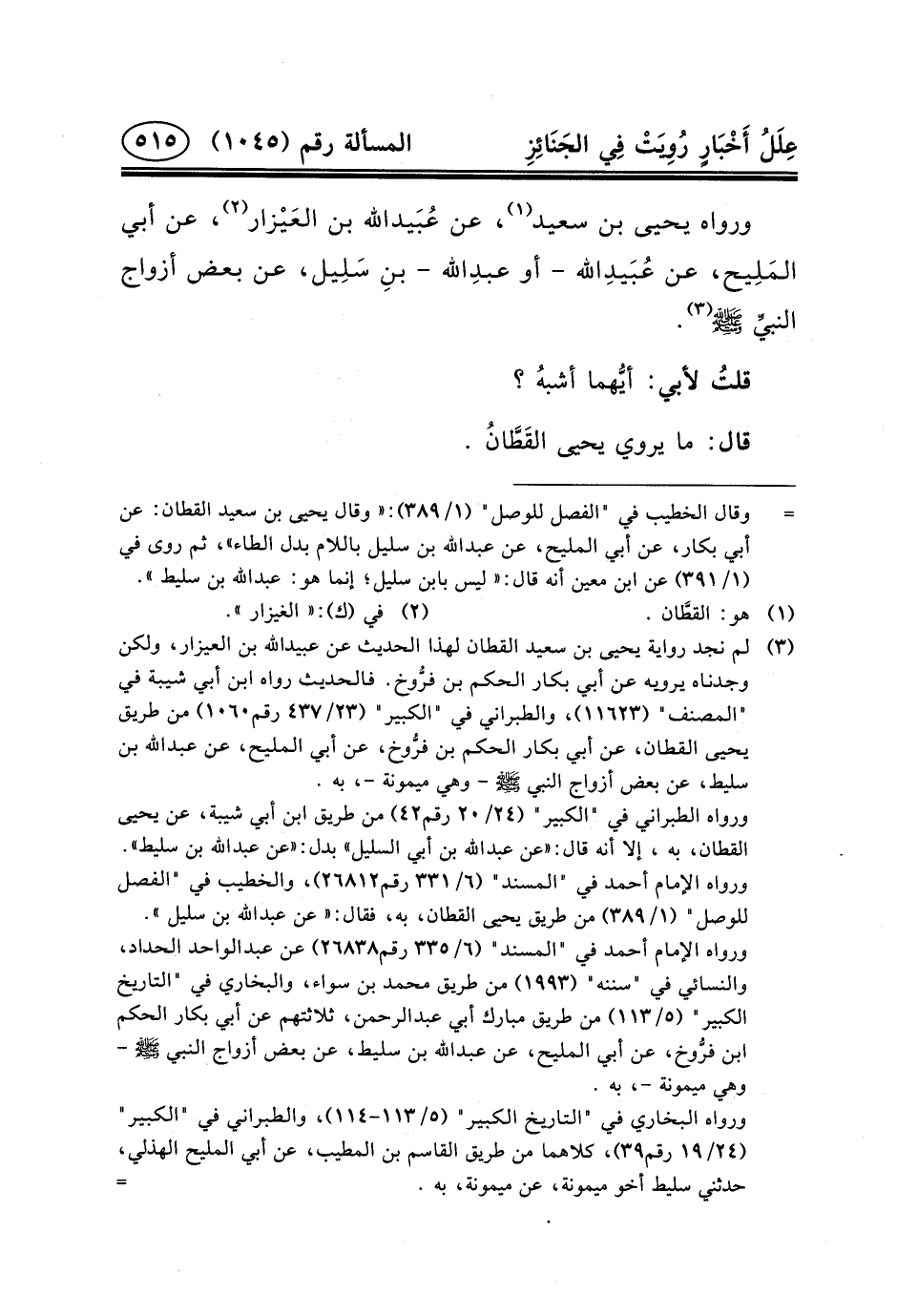 وَرَوَاهُ يَحْيَى بْنُ سَعِيدٍ (١) ، عَنْ عُبَيدالله بْنِ العَيْزار (٢) ، عَنْ أَبِي المَلِيح، عن عُبَيدِالله - أو عبدِالله - بنِ سَلِيل، عن بعض أزواج النبيِّ (ص) (٣) .