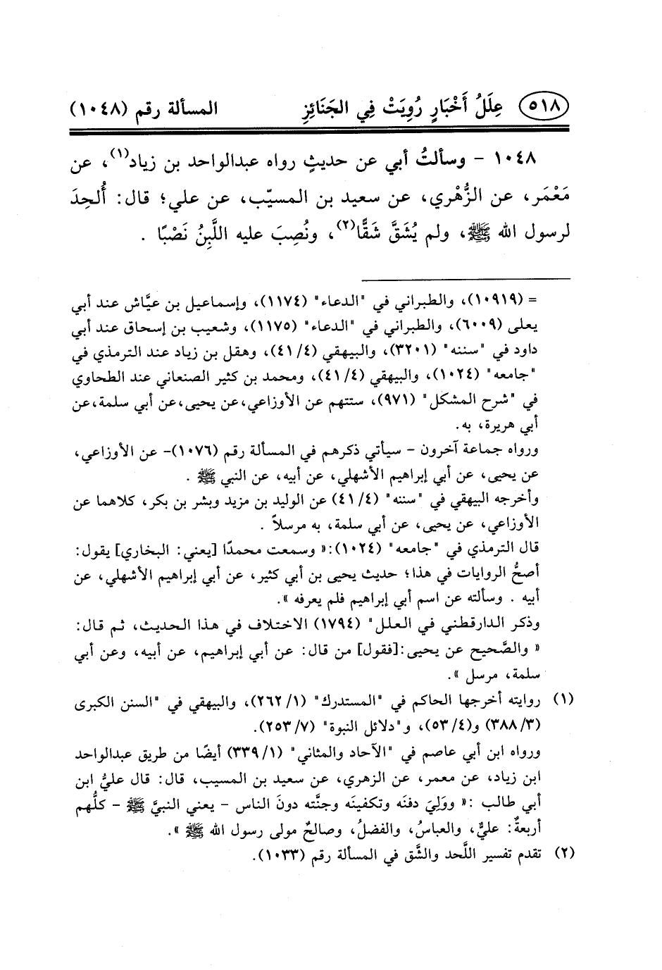 ١٠٤٨ - وسألتُ أَبِي عَنْ حديثٍ رَوَاهُ عبد الواحد بْنُ زِيَادٍ (١) ، عَنْ مَعْمَر، عَنِ الزُّهْري، عَنْ سَعِيدِ بْنِ الْمُسَيِّبِ، عَنْ عَلِيٍّ؛ قَالَ: أُلحِدَ لِرَسُولِ الله (ص) ، وَلَمْ يُشَقَّ شَقًّا (٢) ، ونُصِبَ عَلَيْهِ اللَّبِنُ نَصْبًا.