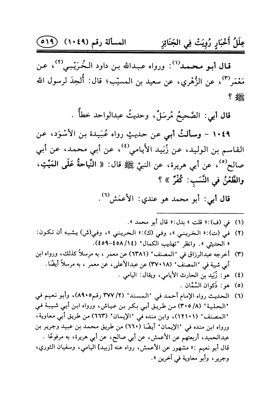 ١٠٤٩- وسألتُ أَبِي عَنْ حديثٍ رواه عُبَيدة ابن الأسْوَد، عَن القاسم بْن الْوَلِيدِ، عَنْ زُبَيد الأَيامي (٤) ، عَنْ أَبِي مُحَمَّدٍ، عَنْ أَبِي صَالِحٍ (٥) ، عَنْ أبي هريرة، عن النبيِّ (ص) قَالَ: النِّياحةُ عَلَى المَيِّتِ، والطَّعْنُ فِي النَّسَبِ: كُفْرٌ؟