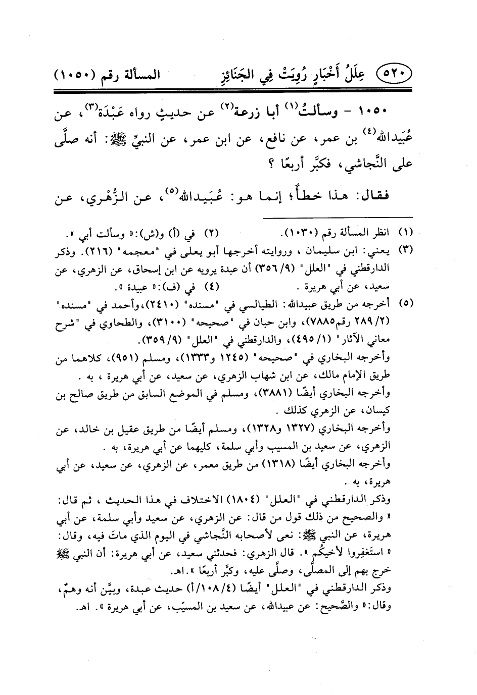 ١٠٥٠ - وسألتُ (١) أَبَا زُرْعَةَ (٢) عَنْ حديثٍ رواه عَبْدَة (٣) ، عن عُبَيدالله (٤) بْنِ عُمَرَ، عَنْ نَافِعٍ، عَنِ ابن عمر، عن النبيِّ (ص) : أَنَّهُ صلَّى عَلَى النَّجاشي، فكبَّر أَرْبَعًا؟