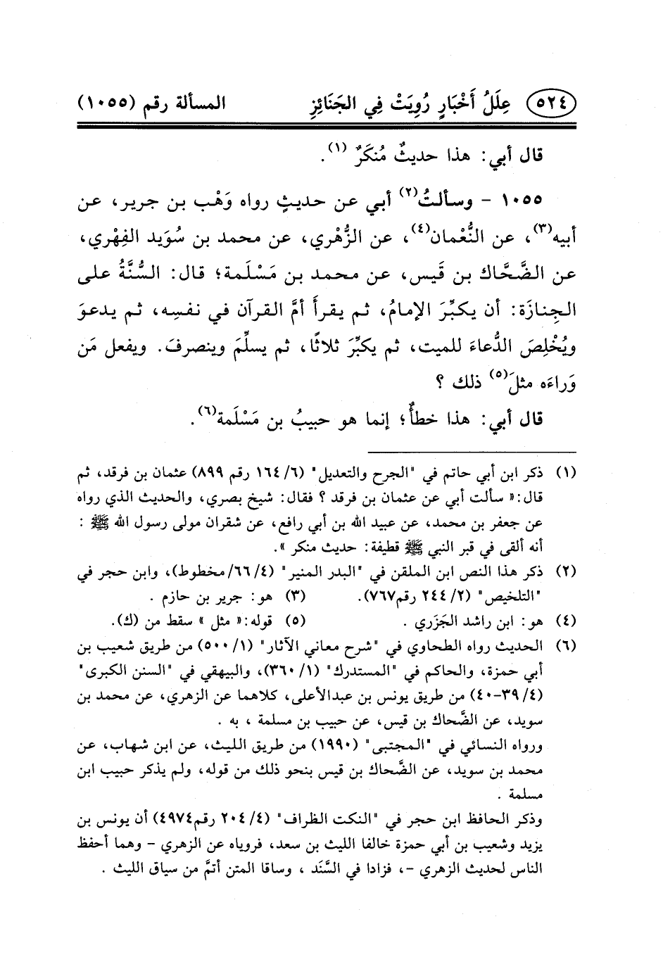 ١٠٥٥ - وسألتُ (٢) أَبِي عَنْ حديثٍ رَوَاهُ وَهْب بْنُ جَرِيرٍ، عَنْ أَبِيهِ (٣) ، عَنِ النُّعْمان (٤) ، عَنِ الزُّهْري، عَنْ مُحَمَّدِ بْنِ سُوَيد الفِهْري، عَنِ الضَّحَّاك بْنِ قَيس، عَنْ مُحَمَّدِ بْنِ مَسْلَمة؛ قَالَ: السُّنَّةُ عَلَى الجِنازَة: أَنْ يكبِّرَ الإمامُ، ثُمَّ يقرأَ أمَّ الْقُرْآنِ فِي نفسِه، ثُمَّ يدعوَ ويُخْلِصَ الدُّعاءَ لِلْمَيِّتِ، ثُمَّ يكبِّرَ ثَلاثًا، ثُمَّ يسلِّمَ وينصرفَ. وَيَفْعَلُ مَن وَراءَه مثلَ (٥) ذَلِكَ؟