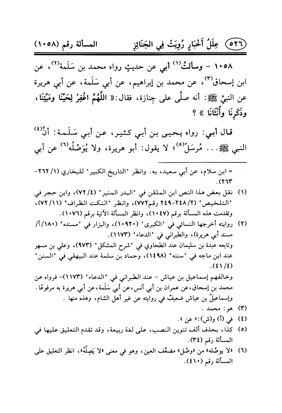 ١٠٥٨- وسألتُ (١) أَبِي عَنْ حديثٍ رَوَاهُ مُحَمَّدِ بْنِ سَلَمة (٢) ،