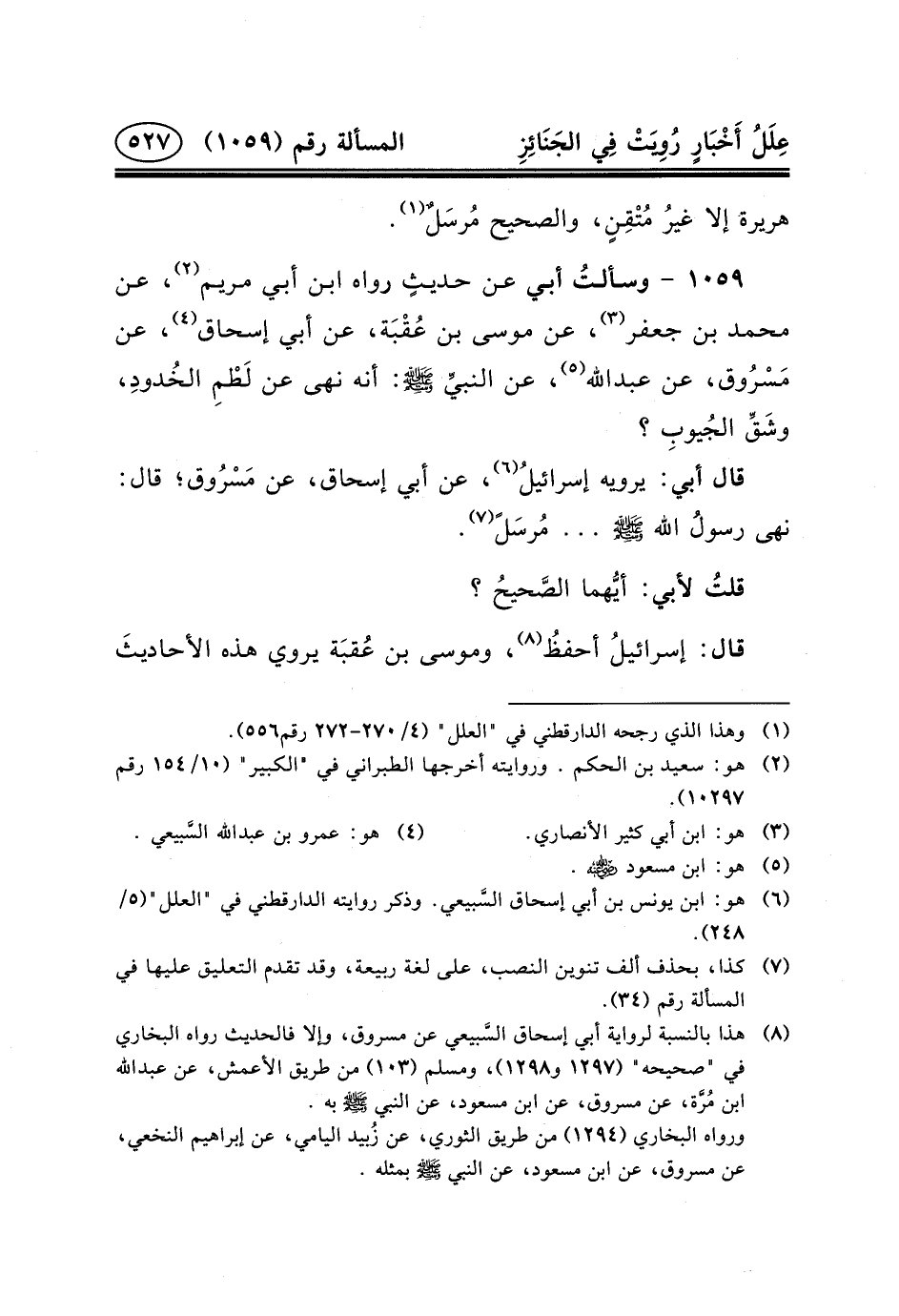 ١٠٥٩ - وسألتُ أَبِي عَنْ حديثٍ رَوَاهُ ابْنُ أَبِي مَرْيَمَ (٢) ، عَنْ مُحَمَّدِ بْنِ جَعْفَرٍ (٣) ، عَنْ مُوسَى بْنُ عُقْبَة، عَنْ أَبِي إِسْحَاقَ (٤) ، عن مَسْرُوق، عن عبد الله (٥) ، عن النبيِّ (ص) : أَنَّهُ نَهَى عَنْ لَطْمِ الخُدودِ، وشَقِّ الجُيوبِ؟